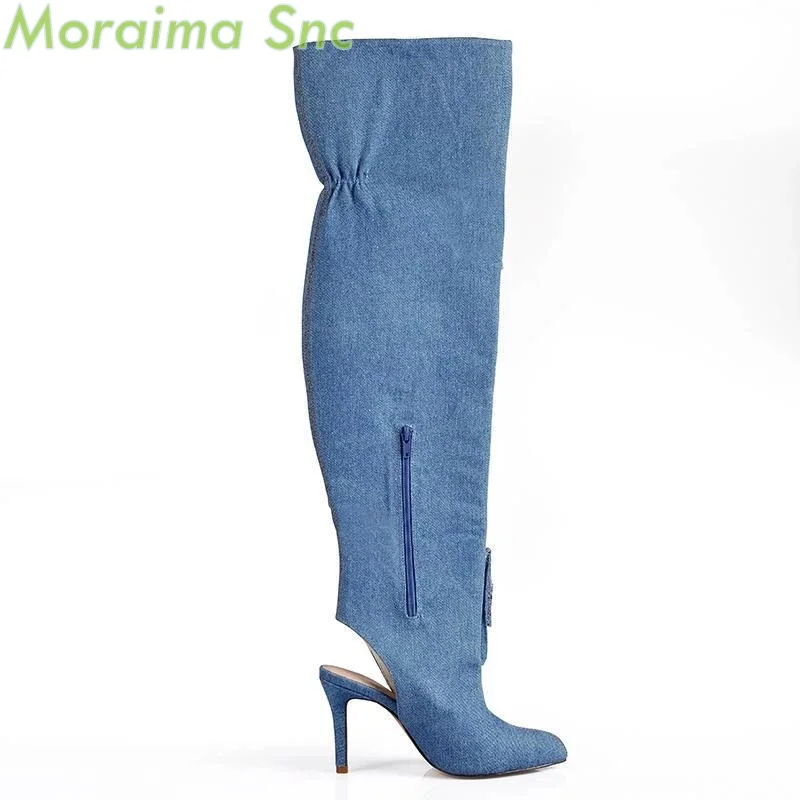 Наименование товара: Moraima Snc/джинсовые длинные сапоги; Женские Сапоги выше колена на молнии с круглым носком и украшением в виде кармана; Новая осенне-зимняя обувь на тонком высоком каблуке