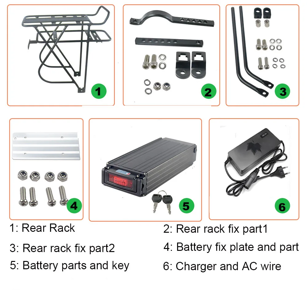 1*36V/48V, фара для электровелосипеда в батареи (опция)1 * Задняя стойка1 * зарядное устройство (опция US/ EU/ AU / UK)1 * кабель подключения аккумулятора двигателя (по умолчанию female XT60)☆Если вы не уверены, подходит ли Аккумулятор для вашего велосипеда, пожалуйста, свяжитесь со службой поддержки клиентов. Спасибо!