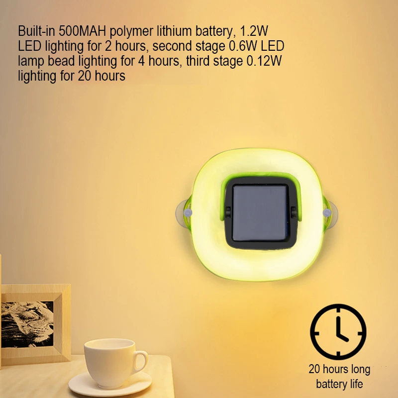 2. Встроенный полимерный литиевый аккумулятор 500 мАч, который может поддерживать 1.2 watt светодиодное освещение для 2,5 часов в течение первых шестерни, 0,6 Ватт LED лампа шарик в вторая передача в течение 5 часов, и 0,12 ватт в Третья передача на 20 часов. 0,25 ватт Солнечная зарядка плата фиксируется на верхней части лампы, которые обычно можно полностью зарядить аккумулятор в течение 10 часов. Сторона лампы оснащена usb-портом для зарядки и usb-кабелем для зарядки. Когда облачно, он может быть заряжен через 1 час и может быть полностью заряжен.