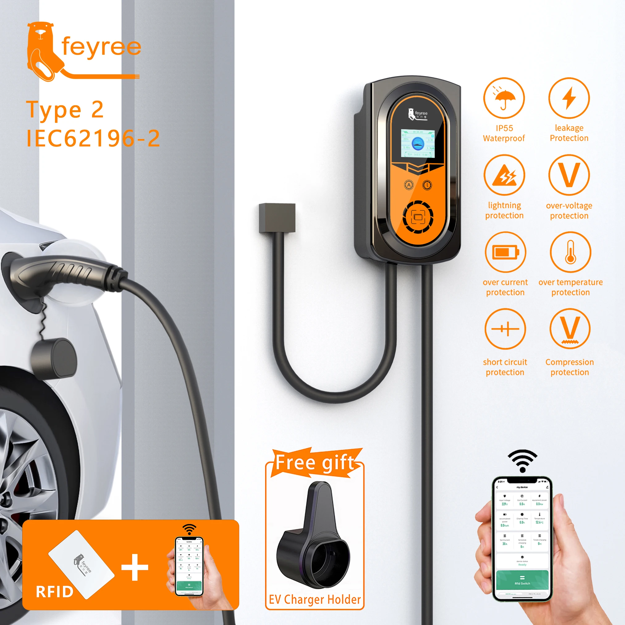 3. Простая установка:Практичный и интуитивно понятный wallbox/зарядная станция для электромобилей и подключаемый гибрид, подходит для использования в помещении и на открытом воздухе благодаря сертификации IP55 (гараж, навес). Он совместим со всеми бытовыми установками и с электромобилями, доступных на рынке, и подключаемыми гибридами с вилкой типа 2, максимальная мощность для вашего автомобиля и достижения более эффективного потребления.