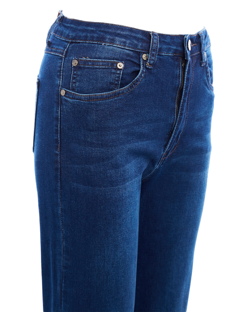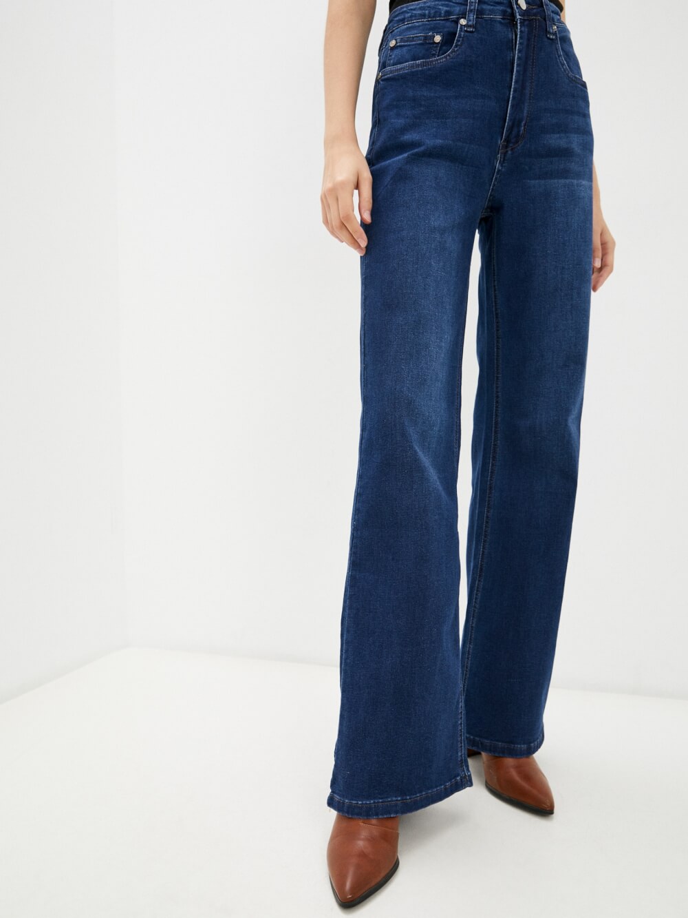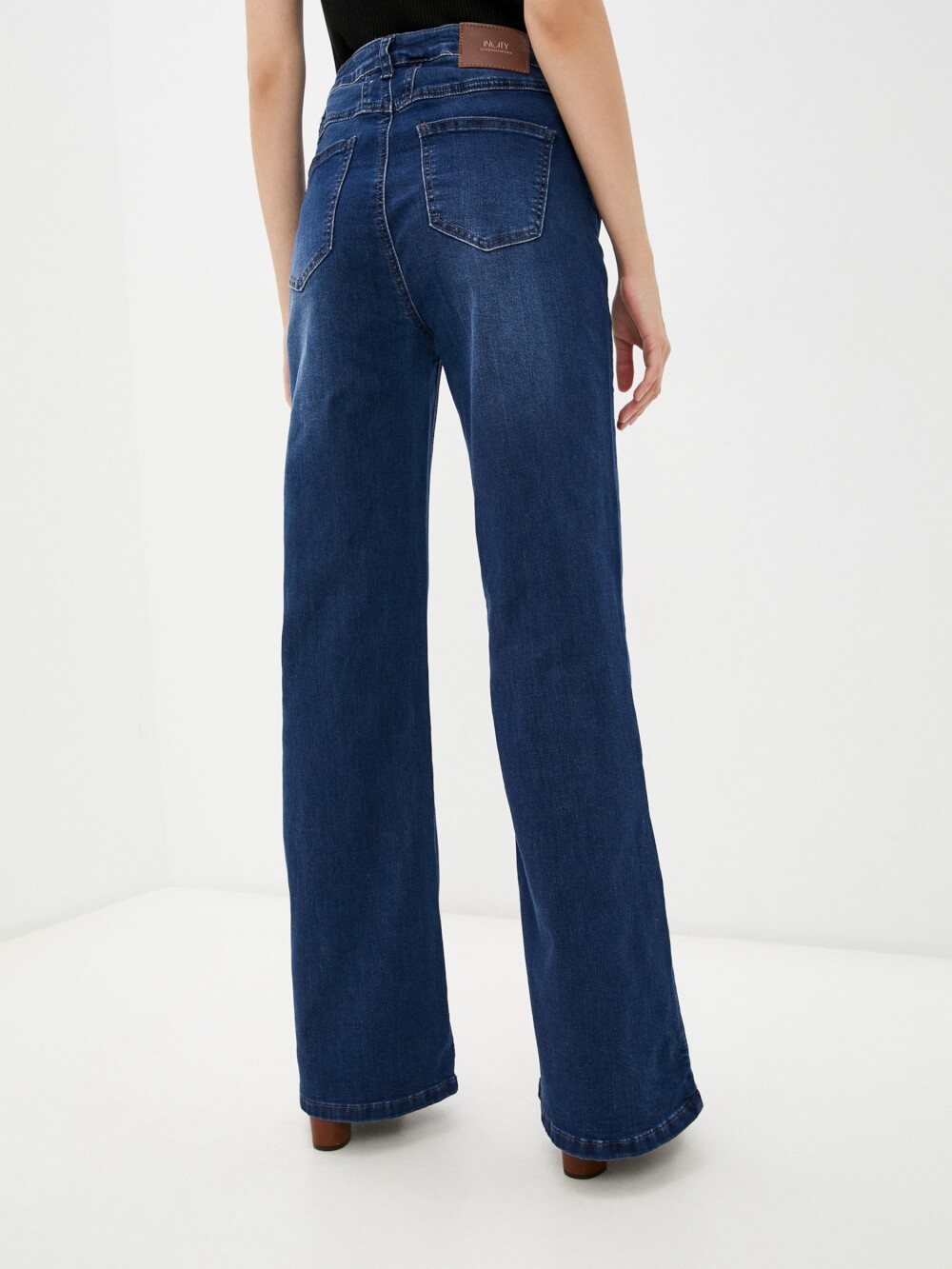 Прямые джинсы темно-синего цвета с осветленными элементами. Модель с высокой посадкой. Минималистичный дизайн с контрастной строчкой, фирменной нашивкой и заклепками на карманах.