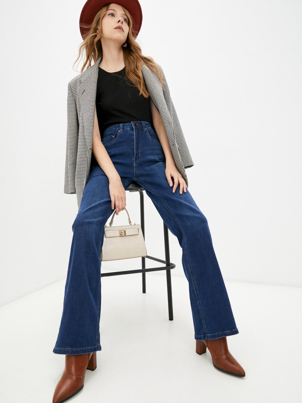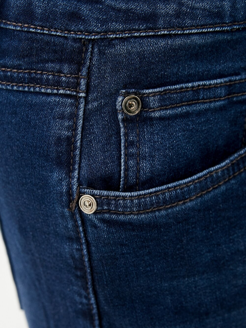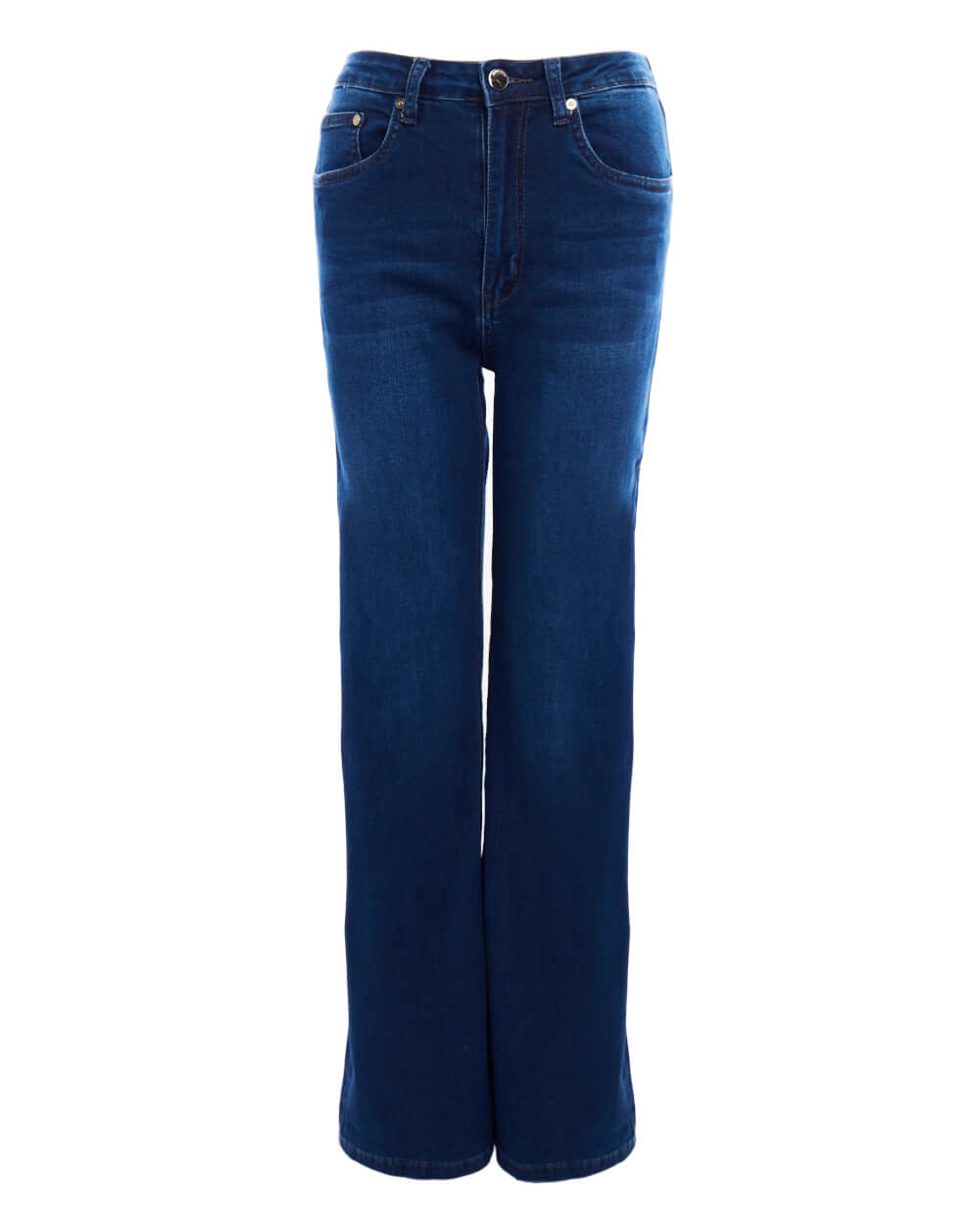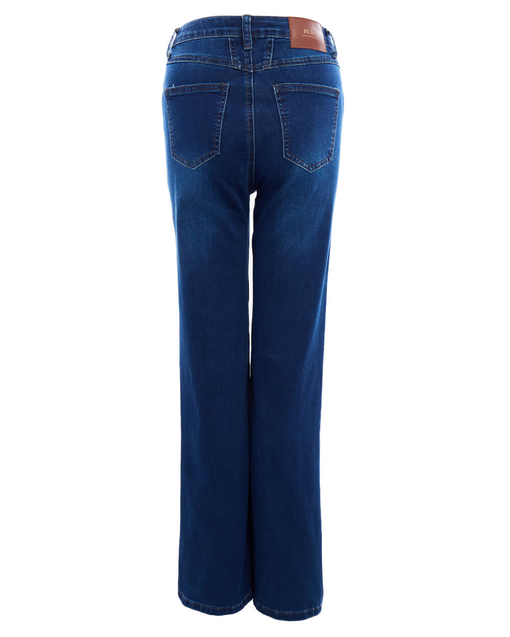 Прямые джинсы темно-синего цвета с осветленными элементами. Модель с высокой посадкой. Минималистичный дизайн с контрастной строчкой, фирменной нашивкой и заклепками на карманах.