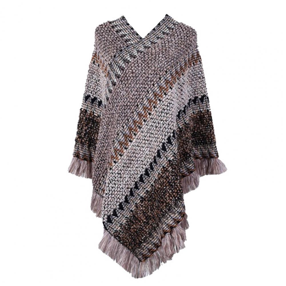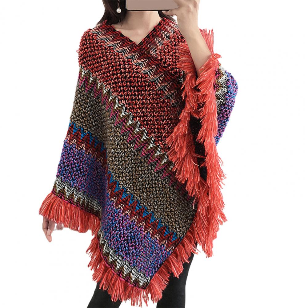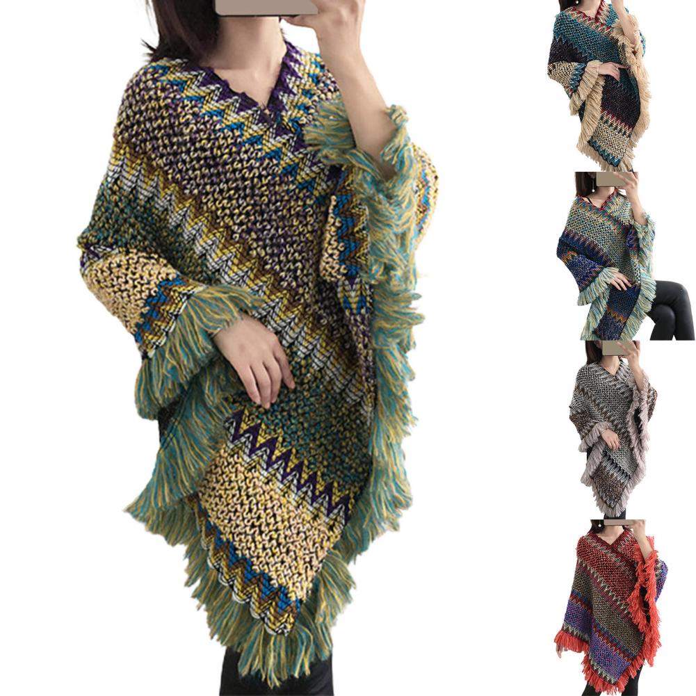 Женская накидка, вязаное пальто с кисточками, осенне-зимнее разноцветное пальто с v-образным вырезом и асимметричным подолом, свитер для повседневной носки