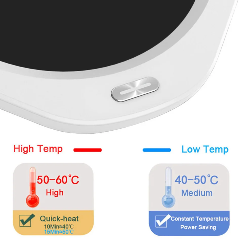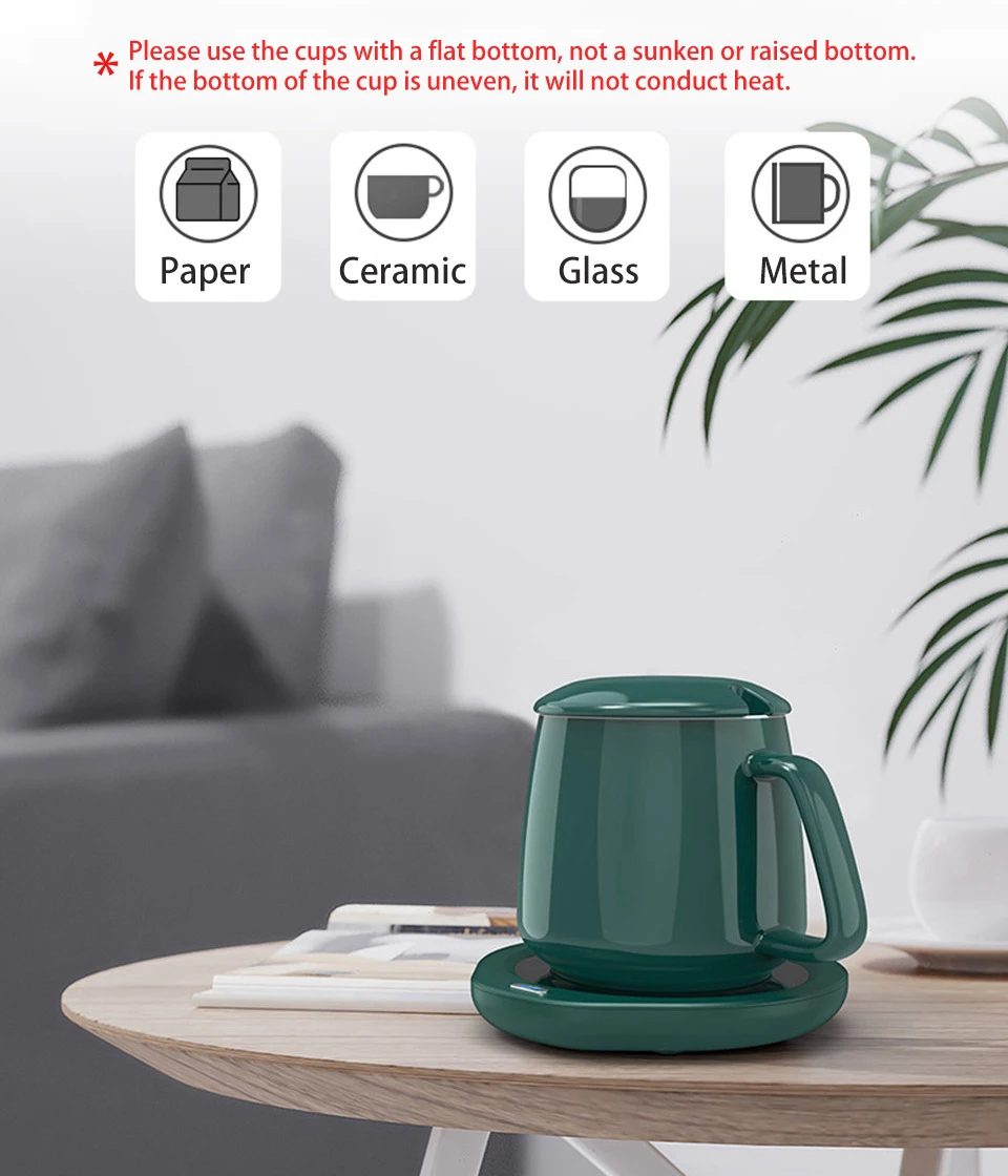 4. Примечание: Основная функция этого нагревателя чашки-это согревание вашего горячего напитка, он не поддерживает кипячение жидкостей. Если вы хотите нагревать воду от нормальной комнатной температуры, пожалуйста, подождите около 15-25 минут, окончательная температура будет держать около 40-55 ℃.