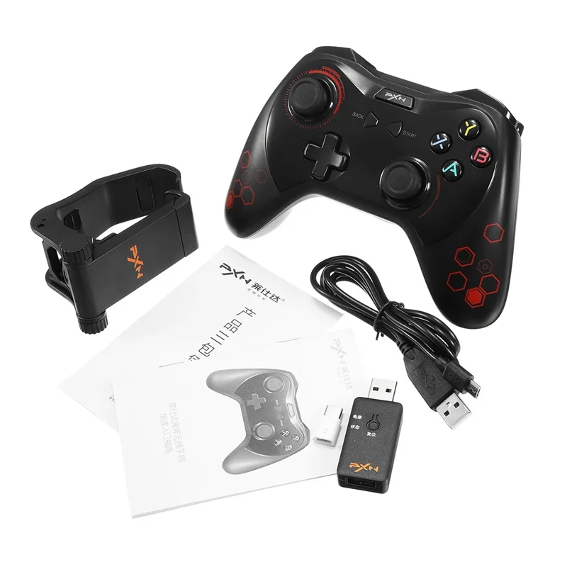 Особенности и характеристики: 1. Высокоскоростная и надежная технология, совместимая с bluetooth, доступна для использования в 7 метрах 2.Android стандарты геймпад ключевое значение, Поддержка Android 4,0 и более поздних версий 3. Встроенный литиевый аккумулятор 550 мАч, интеллектуальная энергосберегающая технология, играющая дольше 4. Точный имитационный джойстик, точная d-накладка, линейная кнопка запуска 5. Включает зажим для телефона, регулируемый угол, поддерживает мобильный телефон 4-6 дюймов 6. Эргономичный дизайн, более удобный 7. Название продукта: PXN 9606 bluetooth-совместимый беспроводной геймпад 8. Совместимость: устройства Android 9. Рабочие платформы: Android смартфон/планшет/ТВ/STB (телеприставка) 10. Рабочие системы: Android 4,0 и более поздние версии 11. Типы подключения: совместимы с bluetooth 12. Время зарядки: 1-2 часа 13. Время работы: 8-10 часов 14. Рабочая мощность: Встроенный литиевый аккумулятор 550 мАч 15. Вес нетто: 189 грамм Посылка: 1x PXN-9606 геймпад 1x Подставка для телефона с зажимом для геймпада 1x PXN-1005 Android активатор сопоставления 1x USB кабель