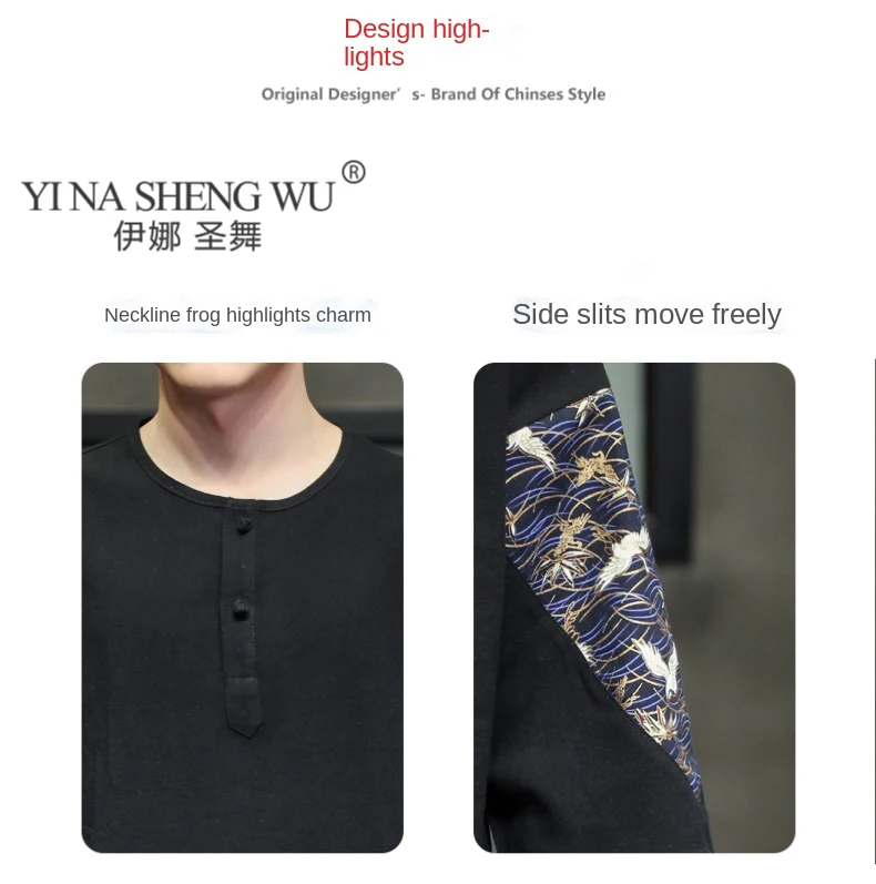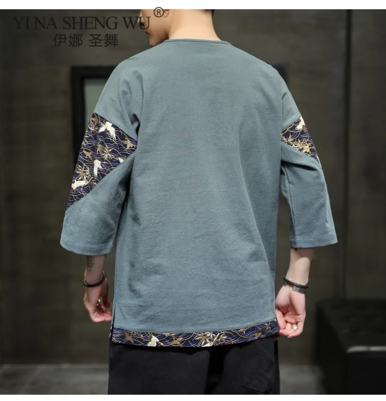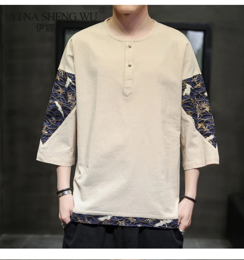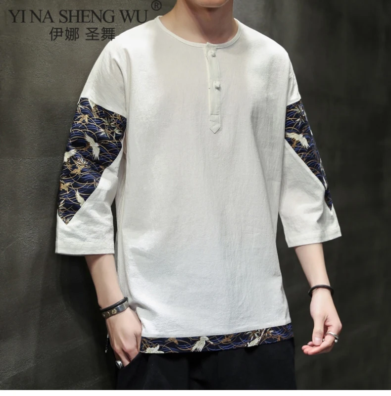 Мужские китайские свободные хлопковые и льняные топы с круглым вырезом и вышивкой большого размера, модные футболки с рукавами с пятью точками