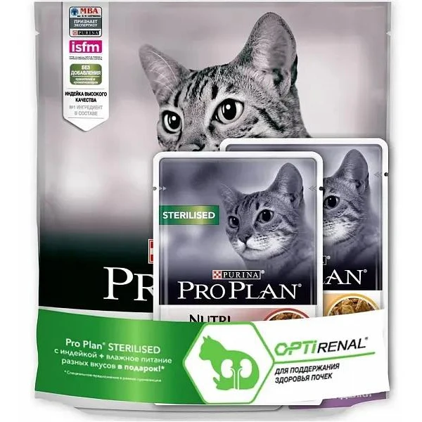 Для взрослых стерилизованных кошек. Поддерживает оптимальный вес кошки. Содержит антиоксиданты для естественной защиты организма. Рекомендации по приготовлению/использованию. Рекомендации по кормлению, позволяющие поддерживать идеальную форму, могут варьироваться в зависимости от возраста животного, его активности и условий окружающей среды. Следите за весом Вашей кошки и корректируйте количество даваемого корма. Следите, чтобы у Вашей кошки всегда была чистая свежая питьевая вода. Для здоровья Вашей кошки регулярно консультируйтесь с ветеринарным врачом. Для взрослой кошки среднего веса (4 кг) требуется 3 пакетика в день, разделенных минимум на два кормления. Индивидуальные потребности кошки могут варьироваться и ежедневное количество корма должно быть скорректировано в соответствии с необходимостью поддержания оптимального веса кошки. Подавайте корм комнатной температуры. Следите, чтобы у вашей кошки всегда была чистая свежая питьевая вода. Гарантированные показатели. Индейка 400 г: белок: 41%; содержание жира: 12%; сырая зола: 7,5%; сырая клетчатка: 4%. Курица в соусе: влажность: 78%, белок: 13.0%, содержание жира: 3.3%, сырая зола: 2.0%, сырая клетчатка: 0.4% Говядина в соусе: влажность 78%, белок: 13%, жир: 3.3%, сырая зола: 2.0%, сырая клетчатка: 0.5%.