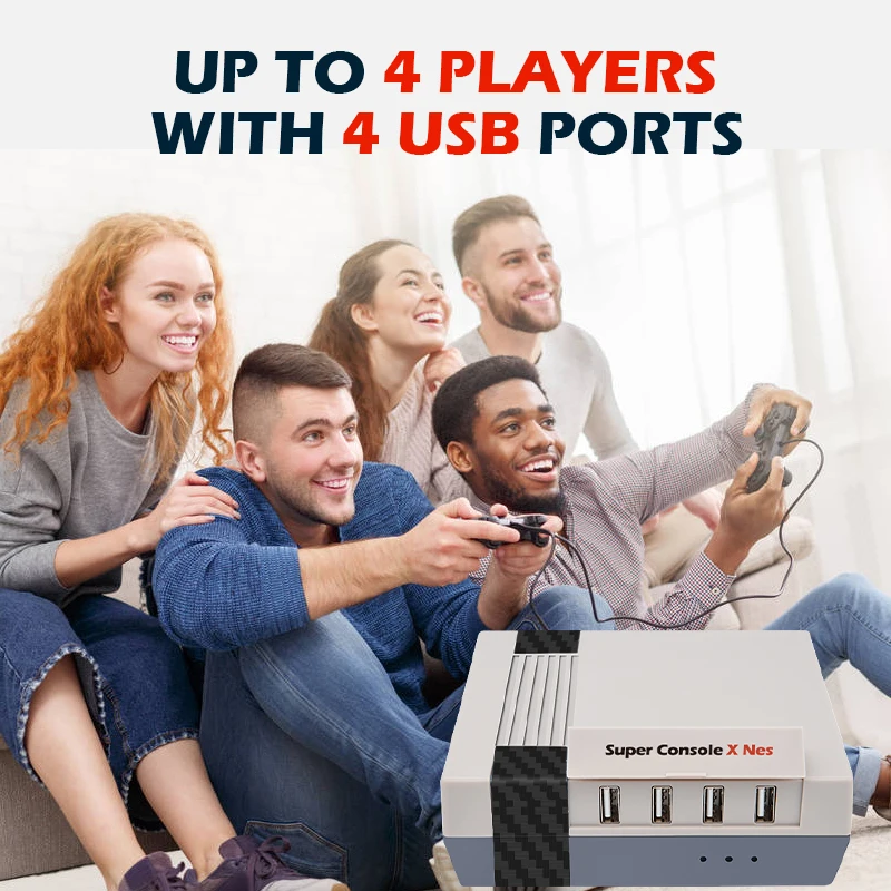 Super Console X NES имеет большое количество встроенных игр с двумя играми, вы можете играть в игры с друзьями и создавать 4 usb-порта, да, он может легко подключить несколько контроллеров для облегчения ваших многопользовательских игр
