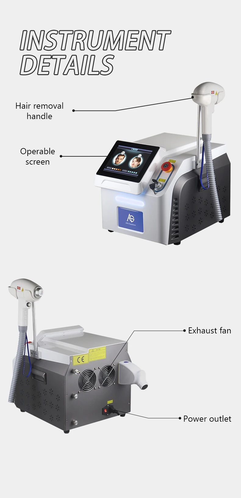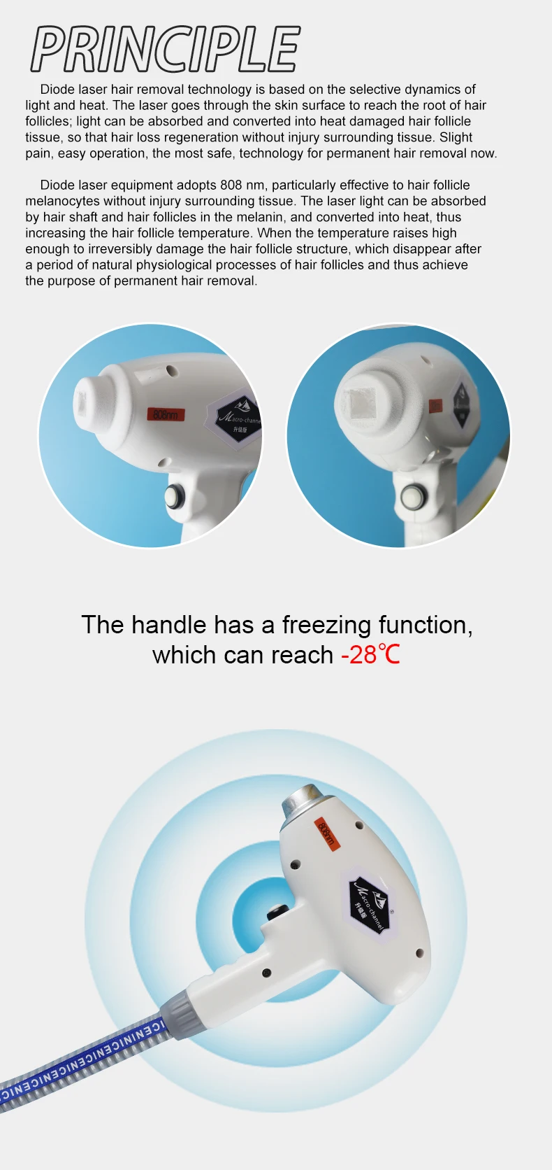 4. С лучшим охлаждением и полупроводниковой системой ручка может замораживать в течение 1 минуты после запуска, большая мощность для машины для удаления волос в быстрое время;