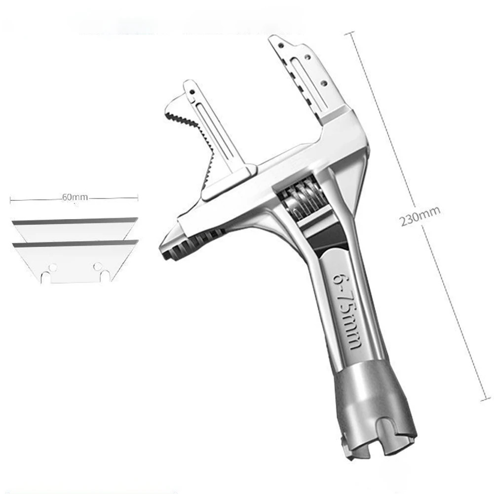Особенности: -Также может быть использован в небольшом пространстве. -Открытие гладкая и не легко надевать и снимать, и дольше срок службы. -Точный вертикальный угол и червь работают плавно и точно. -Подходит для снятия и установки сантехники, трубы, орехи и т. д. -Не повредит декоративные трубы и гайки, как, например, золотое покрытие, вставка из меди и т. д. Спецификация: Размер: Материал: алюминиевый сплав Ширина зажима: 6-75 мм/0,24-2,95 дюймов Зажимная головка Толщина: 10 мм/0,39 дюймов Зажимной: материал подошвы: полиуретан толщина 70 мм/2,76 дюймов Размер: 230x7 5 мм/9,06x2,95 дюймов Цвет: серебристый Пять-в-одном функции: кран установки, ванная комната туалет установки, нож для чистки, нож, открытый конец гаечные ключи Сфера применения: оборудование для ванной, таких как краны, соединение большого диаметра из углеродистой стали, двойной головкой союза клапаны для умывальника водосточных труб и т. д. Примечание: В связи с различиями мониторов и эффектами освещения реальный цвет товара может немного отличаться от цвета на фотографиях. Спасибо! Возможны незначительные отклонения в размере на 1-2 см, возникающую из-за того, что измерения проводились вручную.