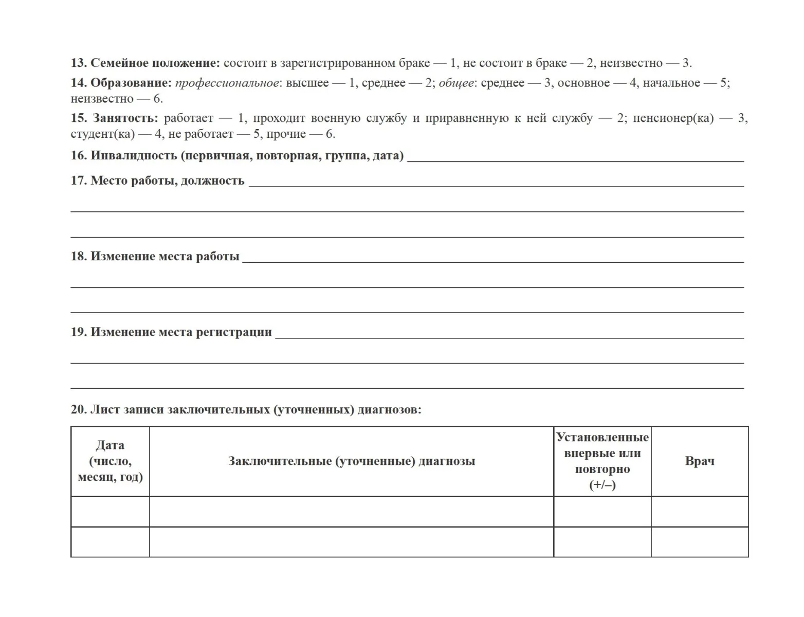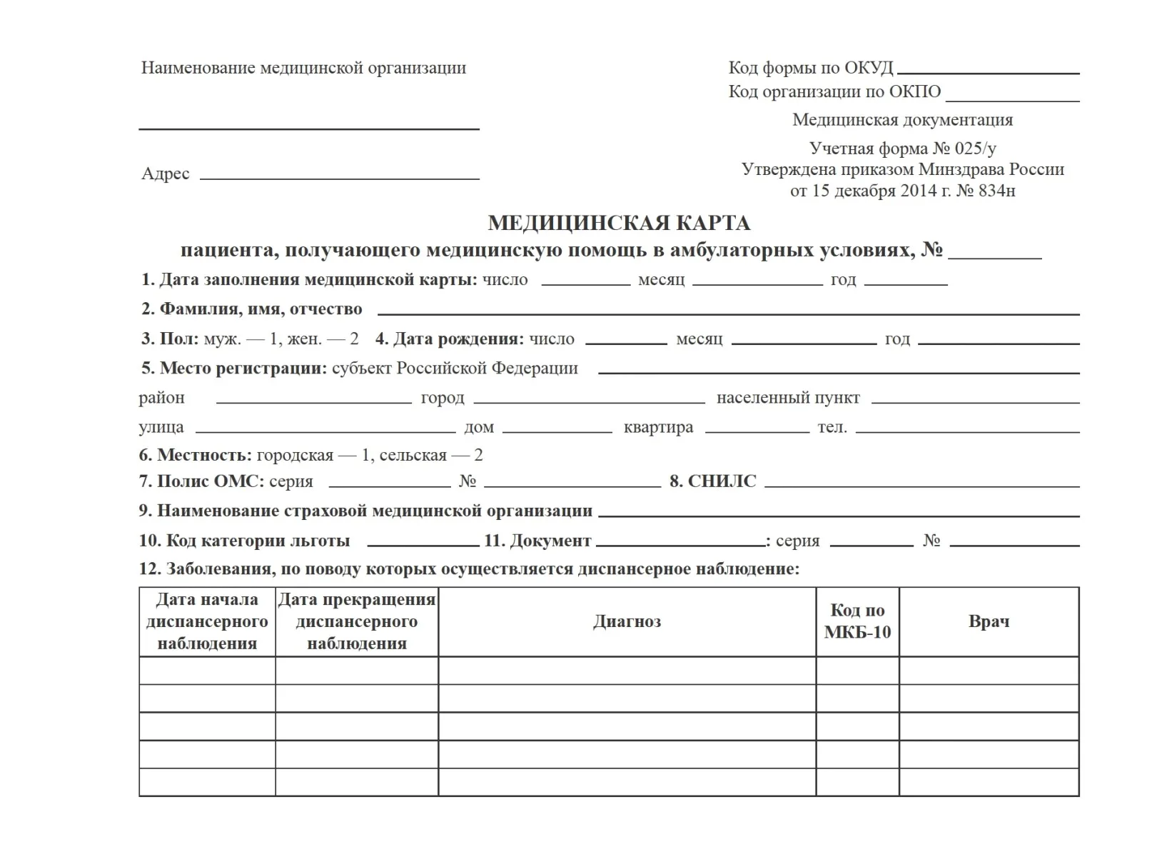 Медицинская карта пациента, получающего медицинскую помощь в амбулаторных условиях — официальная форма 025/у, утвержденная приказом Минздрава РФ. В обязательном порядке используется в медицинских организациях, оказывающих медицинскую помощь в амбулаторных условиях взрослому населению. Предназначена для регистрации лечебных, диагностических, реабилитационных и прочих процедур. Специально разработана с учетом пожеланий врачей, максимально удобна для заполнения.