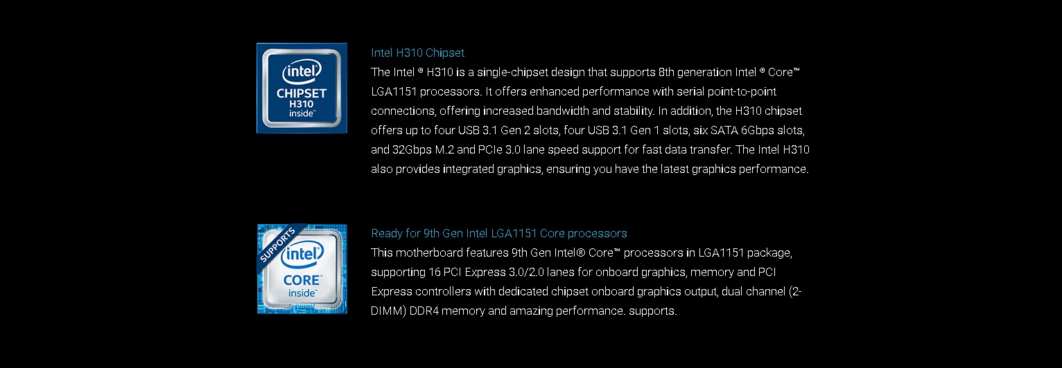 Поддержка процессора | 8th Gen Intel Core i3, 8th Gen Intel Core i5, 8th Gen Intel Core i7, 8th Gen Intel Core i9, 9th Gen Intel Core i9, 9th Gen Intel Core i7 |