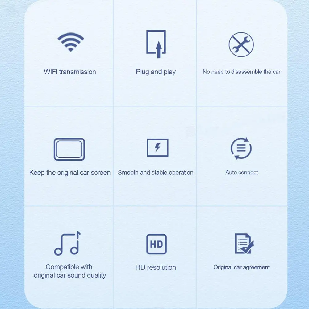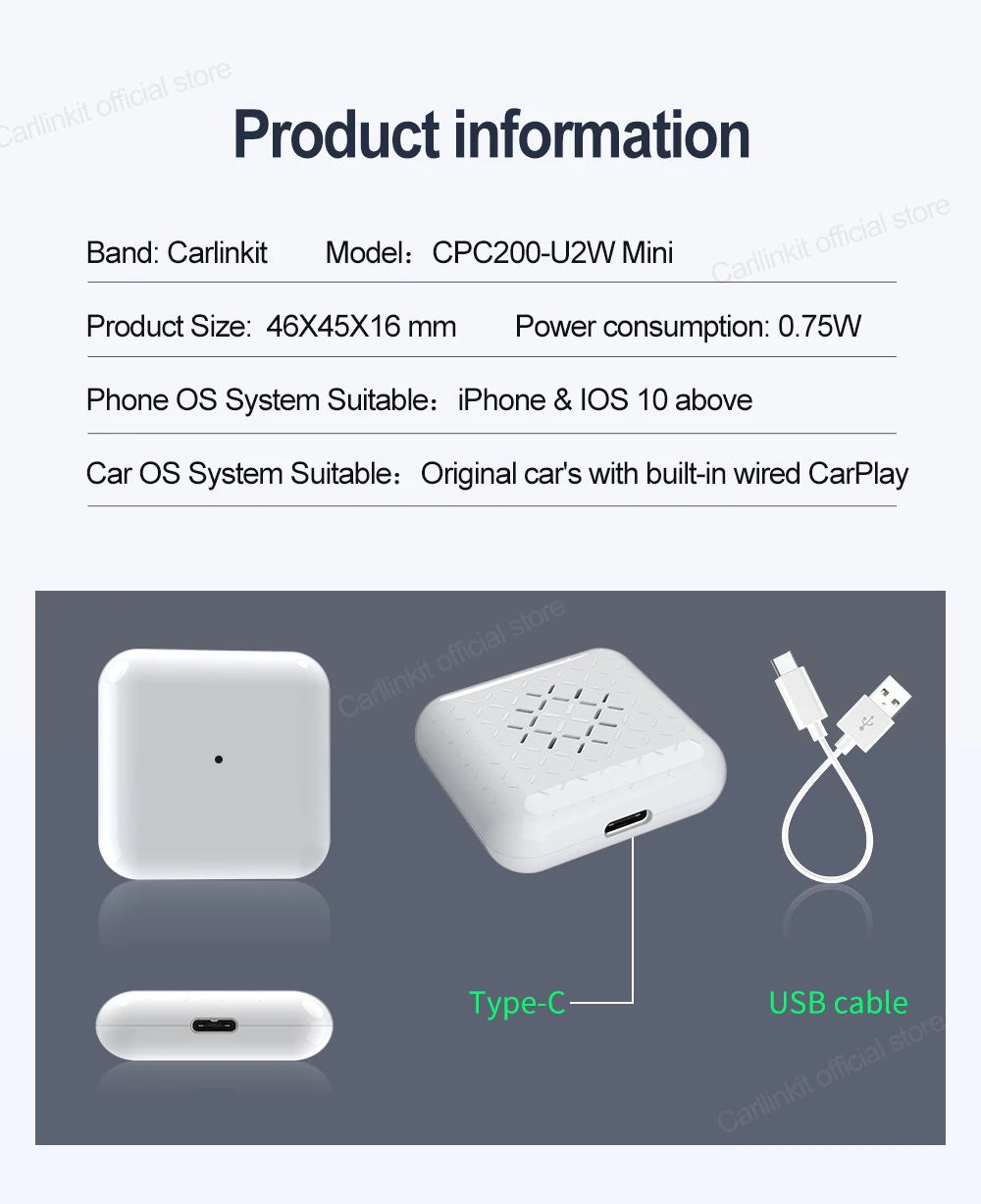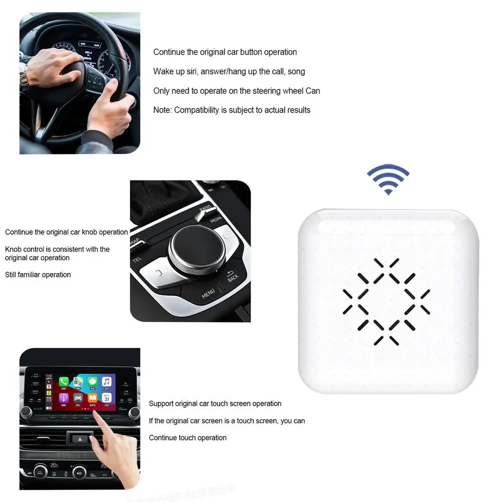 Мини-Смарт-бокс подходит для встроенного проводного автомобиля CarPlay для беспроводной CarPlay. Продукт маленький и легко носить с собой, и он подходит для большего количества моделей автомобилей. Установка охлаждающего отверстия позволяет чипу продукта ускорить рассеивание тепла, более прочный и стабильный.