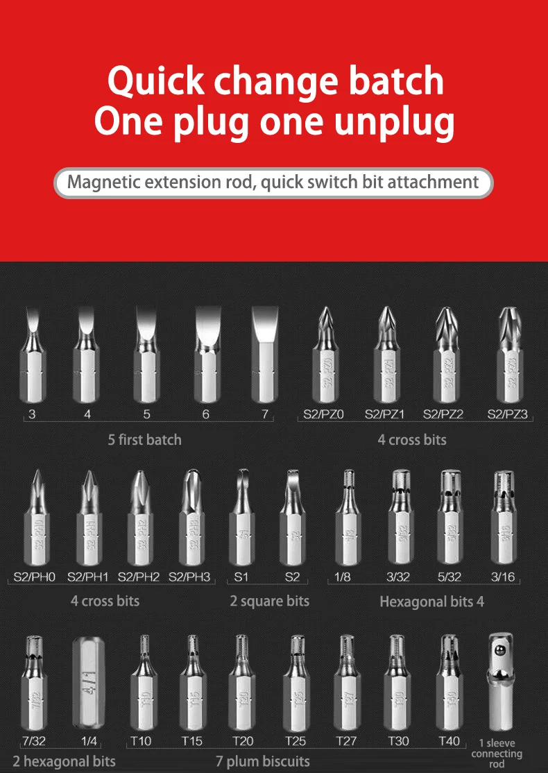 ★Штепсельный шестигранный патрон с магнитом внутри. Подходящие шестигранные биты 6 мм. После вставки бита будет небольшой зазор, и конец бита не будет концентрироваться во время работы, что не влияет на фактическое использование.