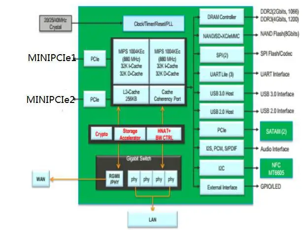 TheGS-RME5000-V1.0 module use the MT7621A chipset.The MT7621A integrates a dual-core MIPS-1004Kc (880MHz),HNAT/HQoS/ Samba/VPN accelerators,5-port GbE switch, RGMII, USB3.0, USB2.0, 3xPCIe, SD-XC. The powerful CPU with rich portfolio is suitable for 802.11ac, LTE cat4/5, edge, hotspot, VPN,AC (Access Control). It can also connect to touch-panel, ZigBee/Z-Wave for Internet Service Router and Home Security Gateway.