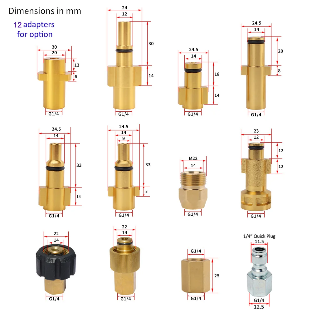 5. Хорошая совместимость, прочные фитинги и адаптер: комплект поставляется с разборным адаптером, совместим с большинством моек под давлением после замены адаптера.