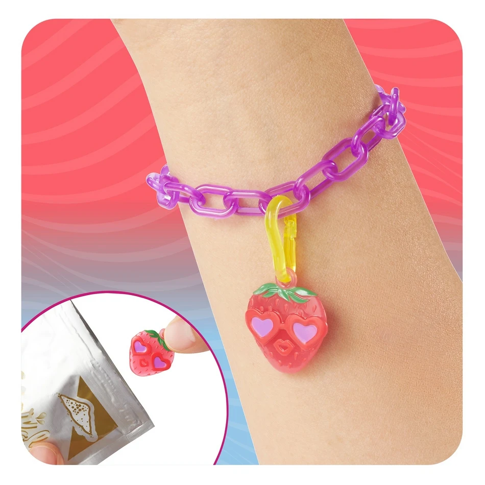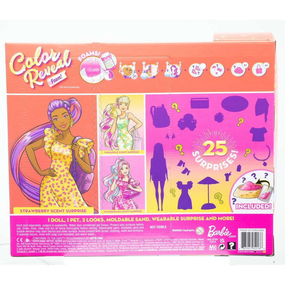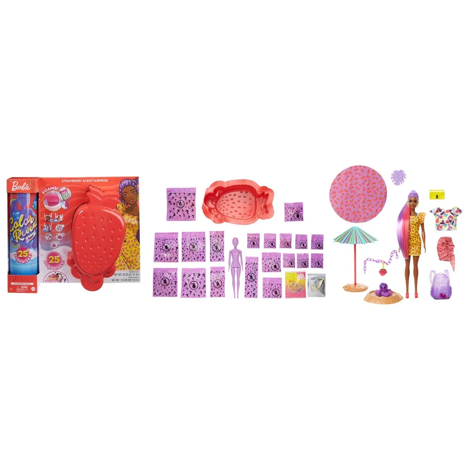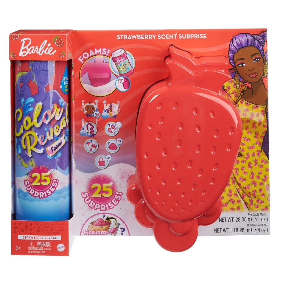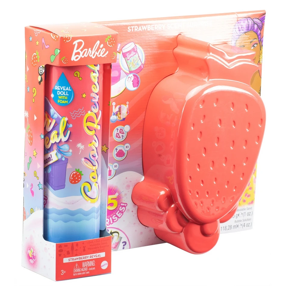 Набор игровой с куклой Barbie Сюрприз из серии Клубника GTN18. Барби дарит малышам 25 волшебных сюрпризов - куклу, питомца, наряды, пляжные аксессуары, браслет, 5 цветовых преображений и многое другое! Извлеките куклу, покрытую краской Color Reveal, из упаковки, наполните тубу водой и пенным раствором с клубничным ароматом, который прилагается в комплекте. Поместите Барби в пену и встряхните. Пена окрасится в яркий цвет, а у куклы проявятся черты лица. Вылейте пену из тубы в упаковку-клубничку и добавьте воды, чтобы устроить вечеринку у бассейна. Но это еще не все! С помощью холодной воды можно изменить макияж, цвет волос и украшений на купальнике куклы, а также цвет питомца и модного аксессуара. Чередуя теплую и холодную воду можно повторять этот эксперимент снова и снова. Barbie и связанные с ним товарные знаки, и фирменный стиль принадлежат Mattel.