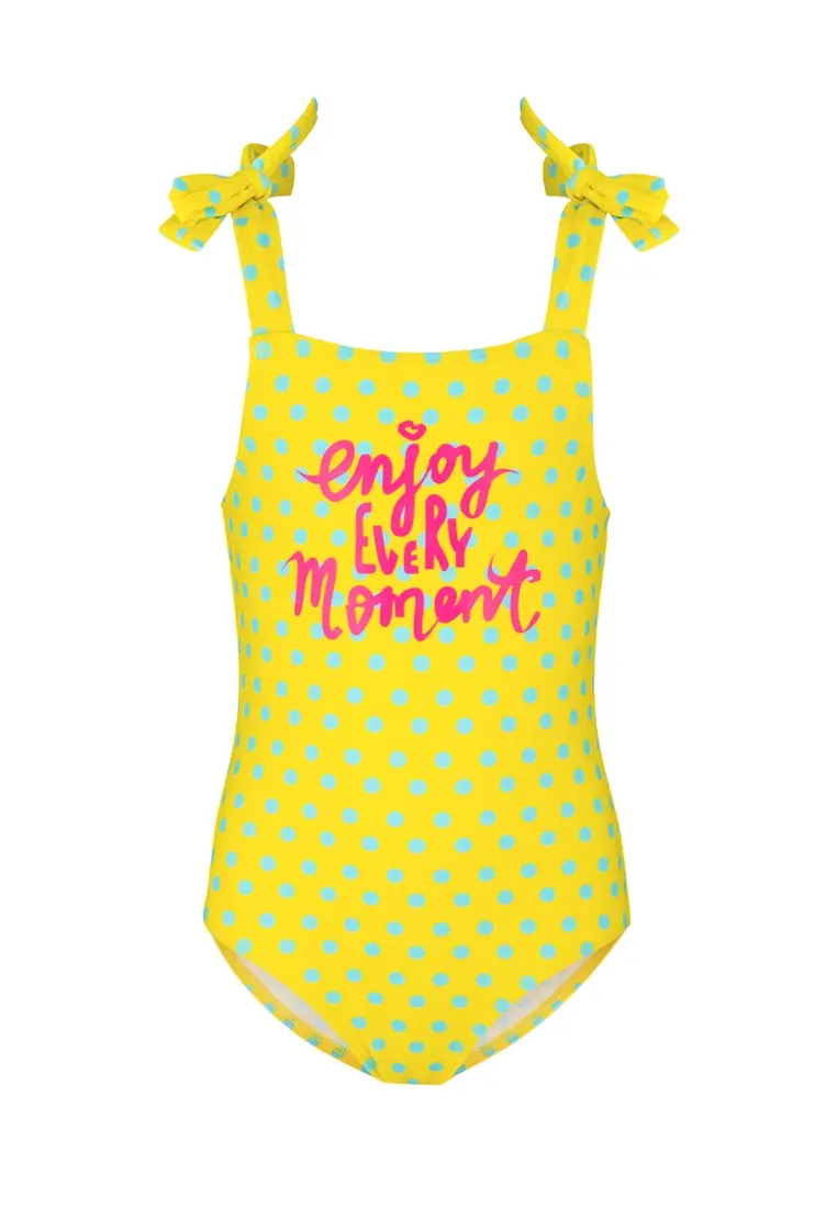 Стильный слитный купальник для девочки. Принт в горошек в теплых летних оттенках с яркой надписью на груди в сочетании с очаровательными бантиками на плечах создают нежный, но при этом динамичный и озорной образ. Принт устойчив к внешним воздействиям, сохраняет свой цвет и внешний вид не смотря на солнце, воду и многократные стирки. Ткань купальника очень мягкая, эластичная и быстросохнущая, обладает защитой от солнечных лучей SPF 50. Крой симметричен спереди и сзади, поэтому спинка закрыта до лопаток. Передняя часть купальника и ластовица имеют подкладку из полиэстера. Бретельки-завязки обеспечивают удобную регулировку по росту именно под вашу малышку и, благодаря им, купальник может быть использован не один сезон. Универсален и комфортен как для бассейна, так и для активного пляжного отдыха.