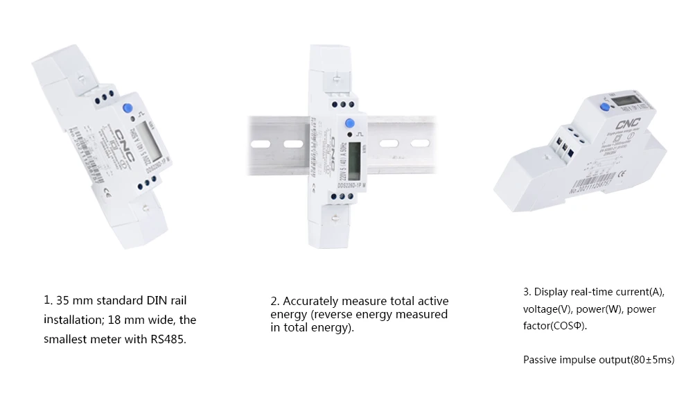 DDS226D-1P Однофазный счетчик энергии на DIN-рейке типа M может точно и напрямую измерять активную энергию 50 Гц/60 Гц, ток в реальном времени, напряжение в реальном времени, мощность в реальном времени, энергия фактора силы от сети электричества АК одиночной фазы.