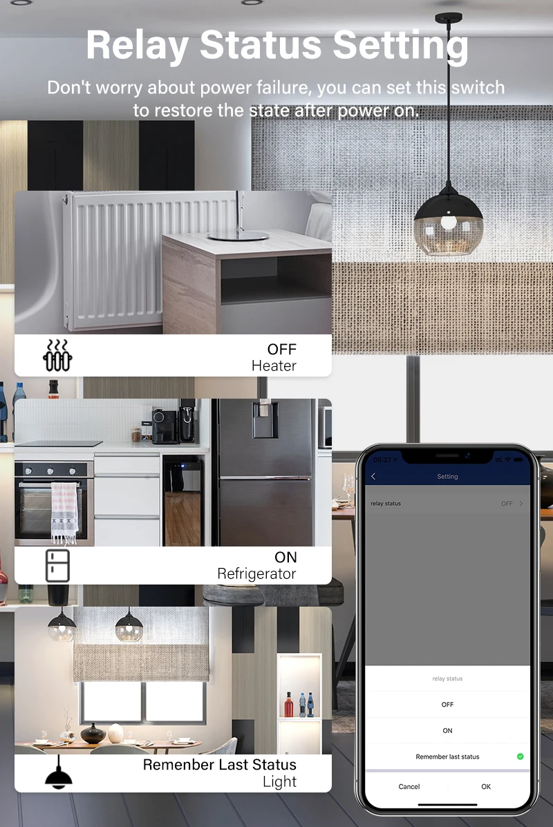 Не беспокойтесь о сбое питания, вы можете установить этот переключатель, чтобы восстановить состояние после включения питания.