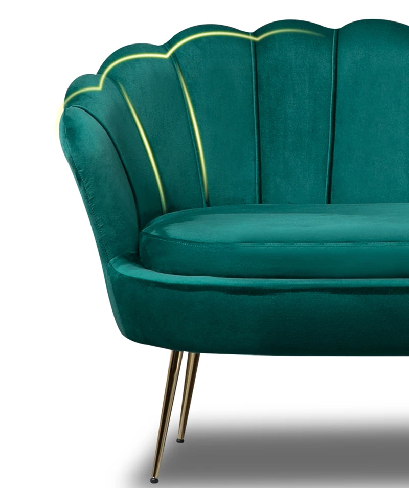 Подлокотник, спинка, внешний расширяющийся лепестковый дизайн, сочетание фланели и роскошных золотых ножек модно и неотразимо, просто и элегантно!