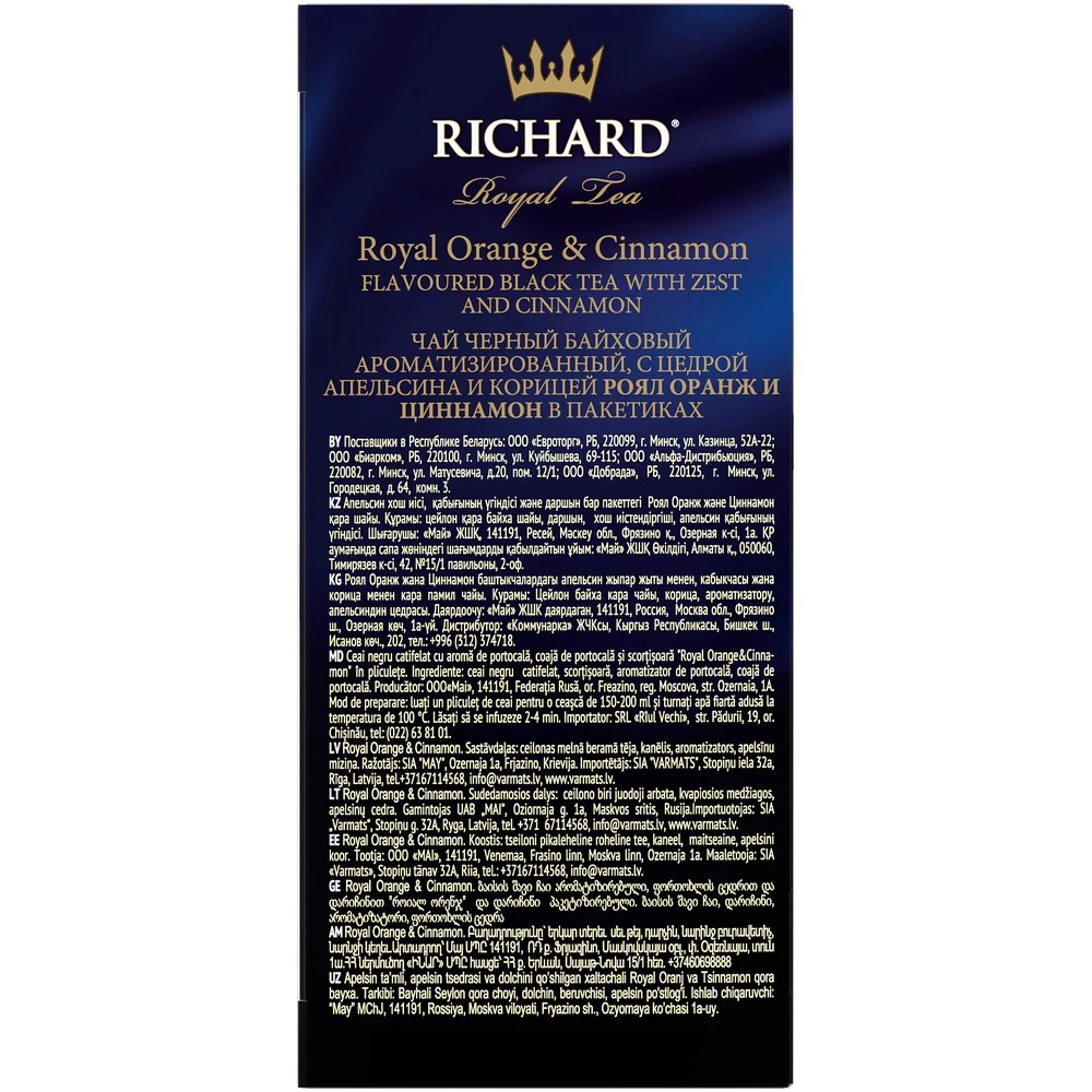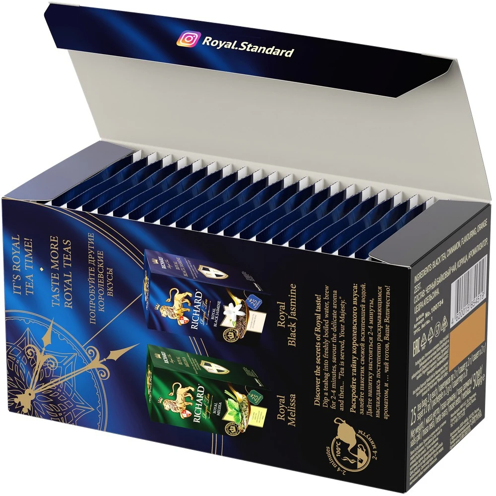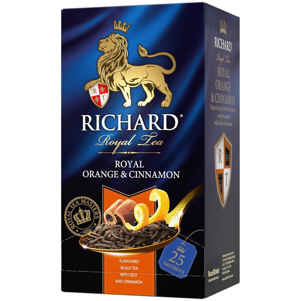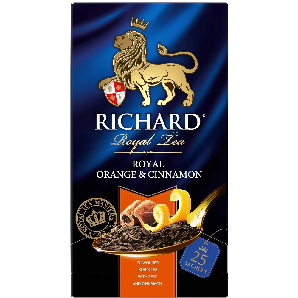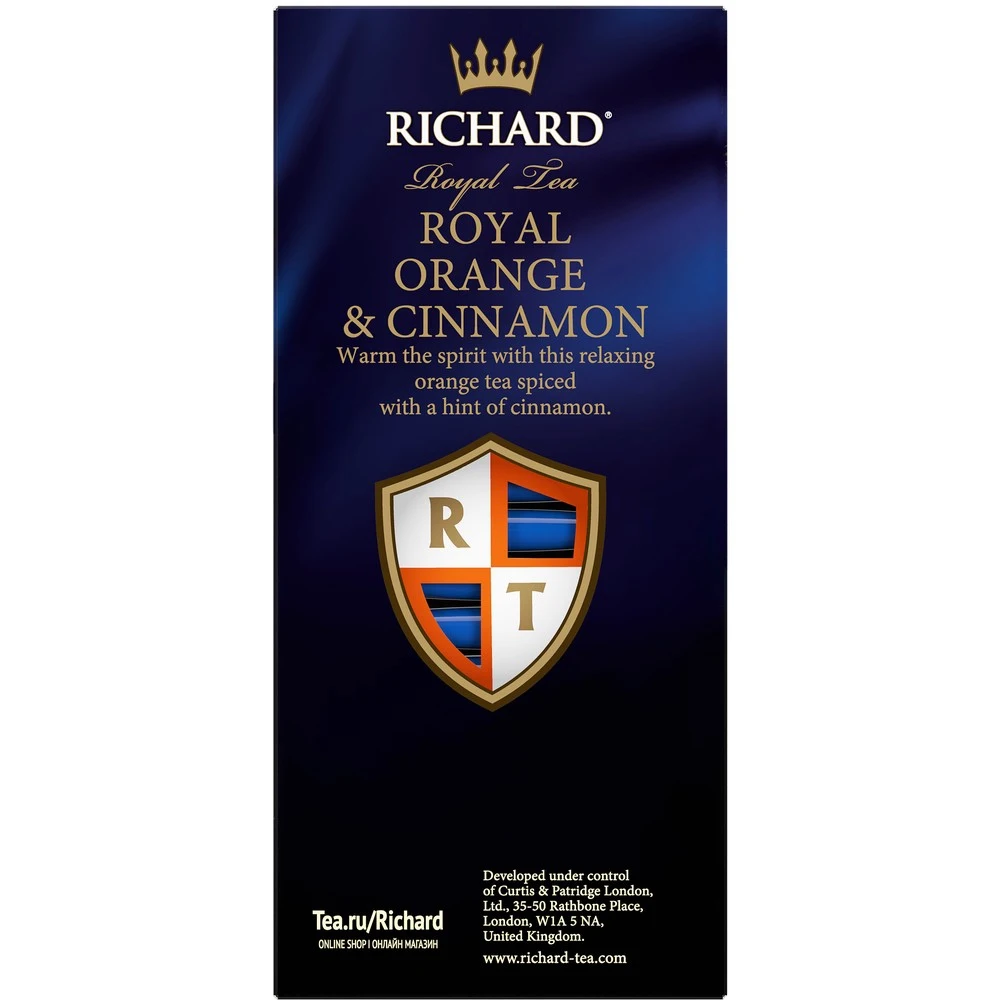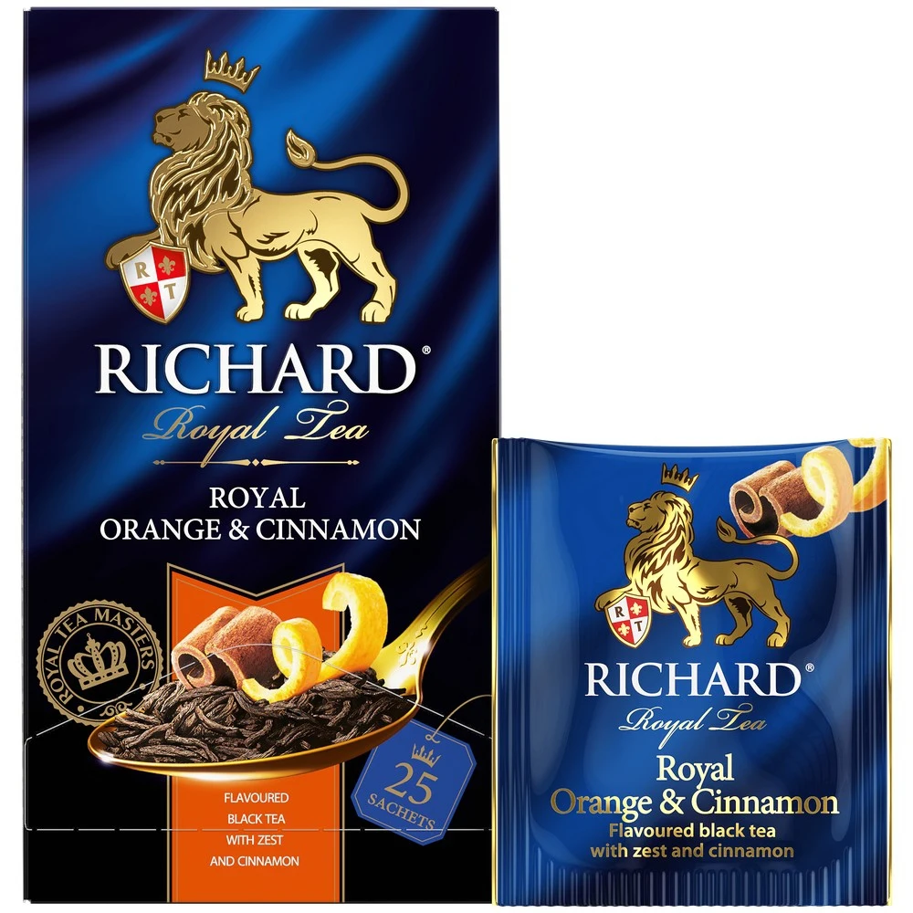 Чай Richard Royal Orange & Cinnamon - подарок, доставленный из дальних колоний специально для Её Величества, и ставший неотъемлемой частью вечернего королевского чаепития. Аромат горячего апельсина согревает и расслабляет, а пряные ноты корицы создают настроение домашнего уюта. Попробуйте! По рецептам королевского двора Richard Royal Masala Chai