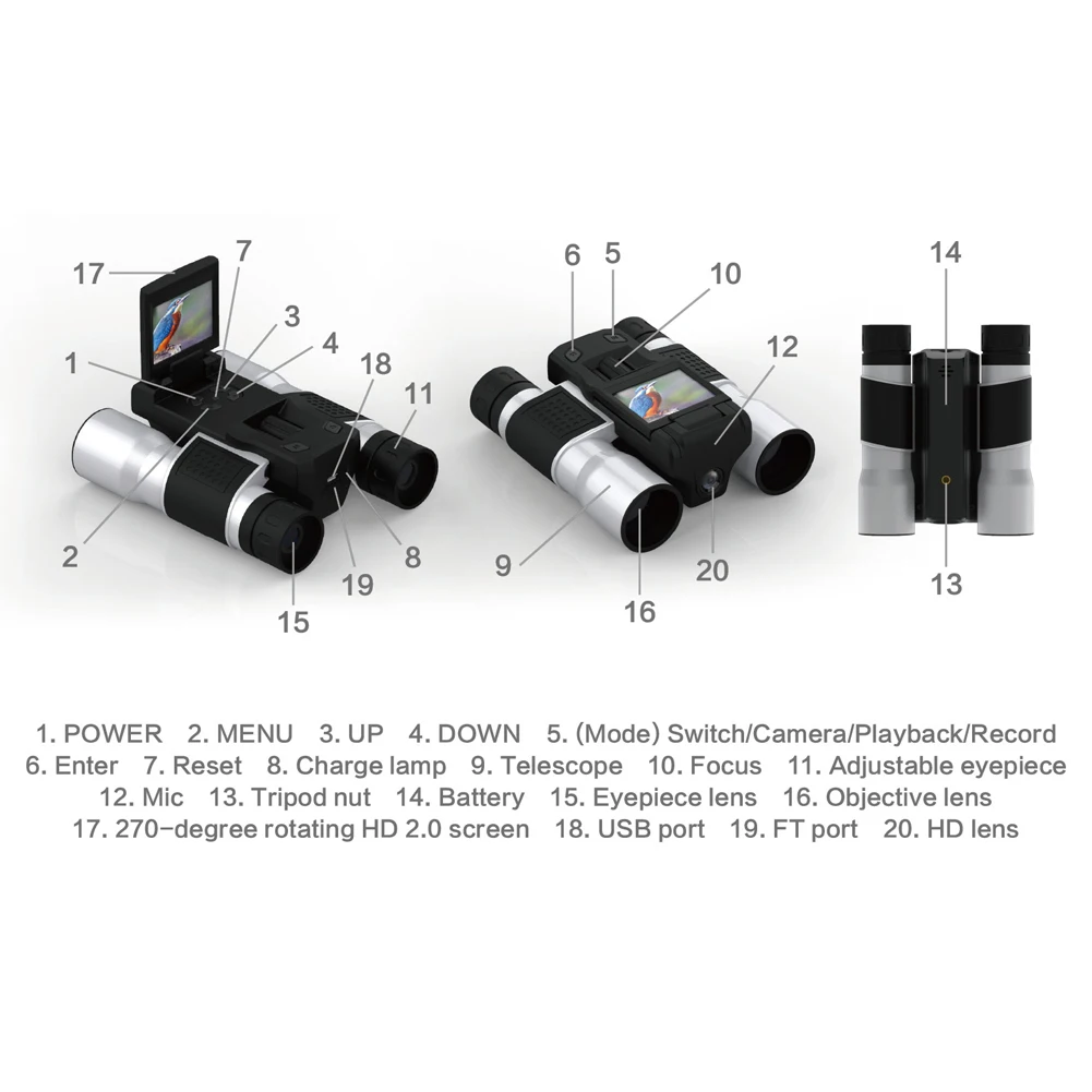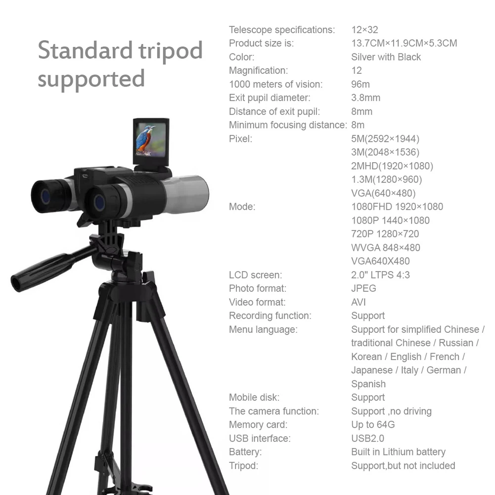 This is a perfect 2-in-1 of all-optical binoculars and digital camera (Digital recording binoculars), which having a 270° rotating 2.0TFT scree, supporting to rotate in any direction to adjust the angle and watch the screen. Its optical aperture of 32MM supports 12x optical zoom. If you need it, come and have a try, it will not let you down.