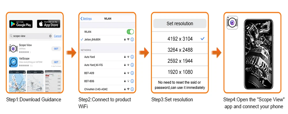 1. Эндоскоп должен использовать его самоактивирующийся WiFi сигнал, не требует домашнего WiFi, может использоваться на открытом воздухе.