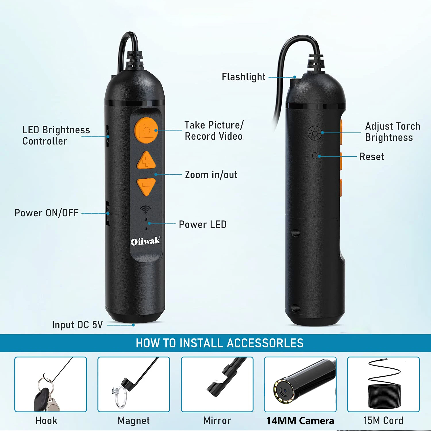 Oiiwak эндоскоп обеспечивает Неразрушающий осмотр труднодоступных мест, таких как ремонт автомобилей, промышленный механический осмотр, фиксация труб, внутренние стены, Чердаки, желоба, канализационные трубы, вентиляционные отверстия, воздуховоды, двигатели, шестерни, вентиляционные трубы, двигатели, углы диванов, трубы для ванной, туалеты.