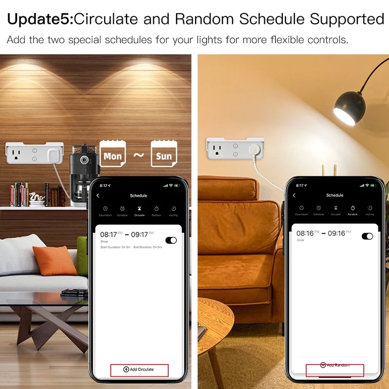 4.[Гибкий график] таймер вашего расписания в приложении Smart Life для двух подключенных устройств независимо без помех, чтобы задать время для включения/выключения и даже с опцией обратного отсчета для более гибкого управления; Кроме того, он разработан с новыми обновлениями как случайные, Циркулирующие и вставляемые настройки.