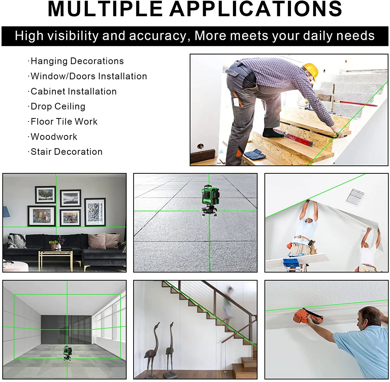 4X360 ° зеленые 16 лазерных линий: наш самонивелирующийся лазерный уровень имеет 2 горизонтальных 360 ° плоскость, две вертикальные 360 ° плоскость, 16 лазерных линий, которые могут покрыть пол, стены и потолок по всей комнате. Горизонтальные линии и вертикальные линии пересекаются под углом 90 ° помогут вам быстро визуализировать и закончить квадратную планировку. Портативный размер делает его более удобным и удобным в использовании даже для небольших проектов ручной работы.