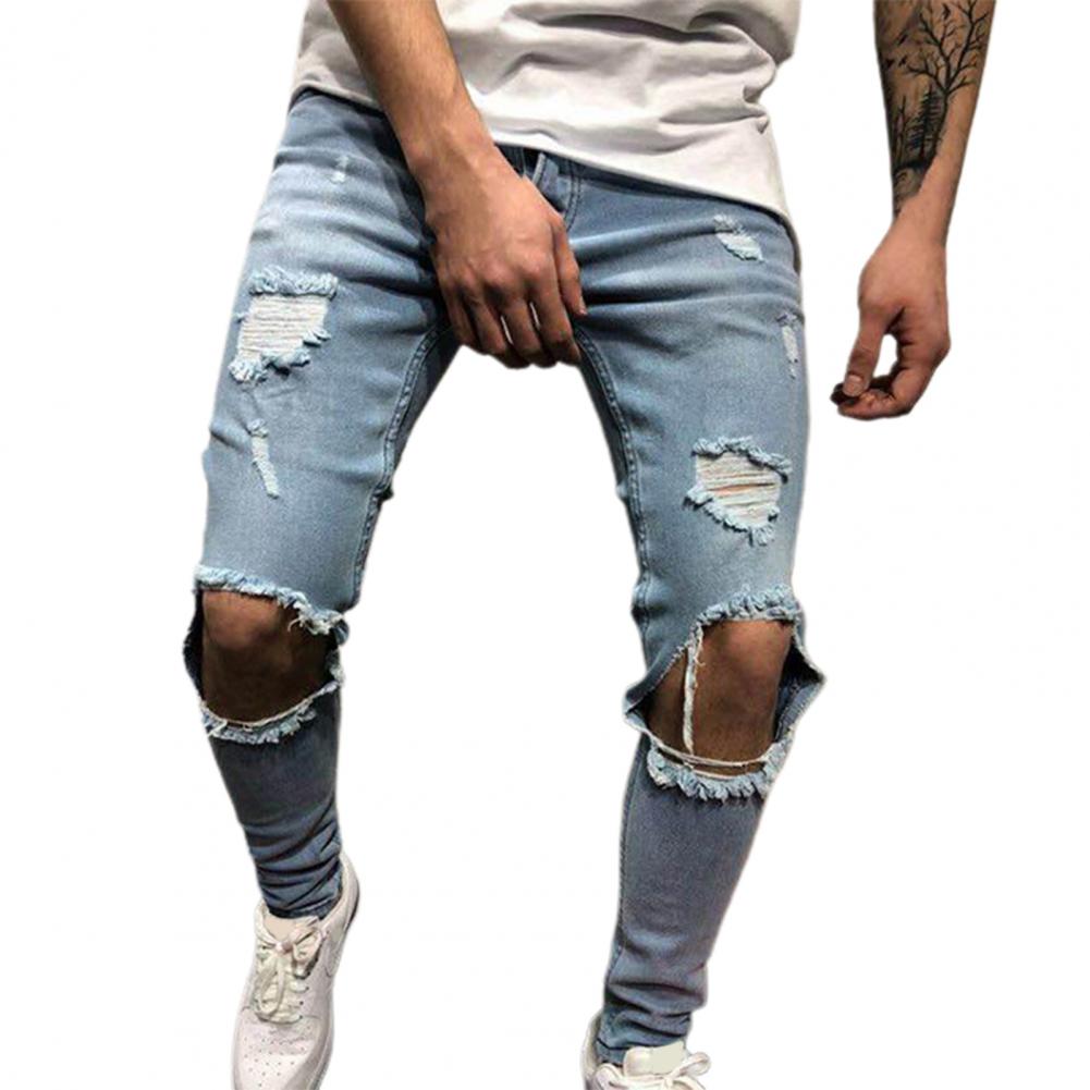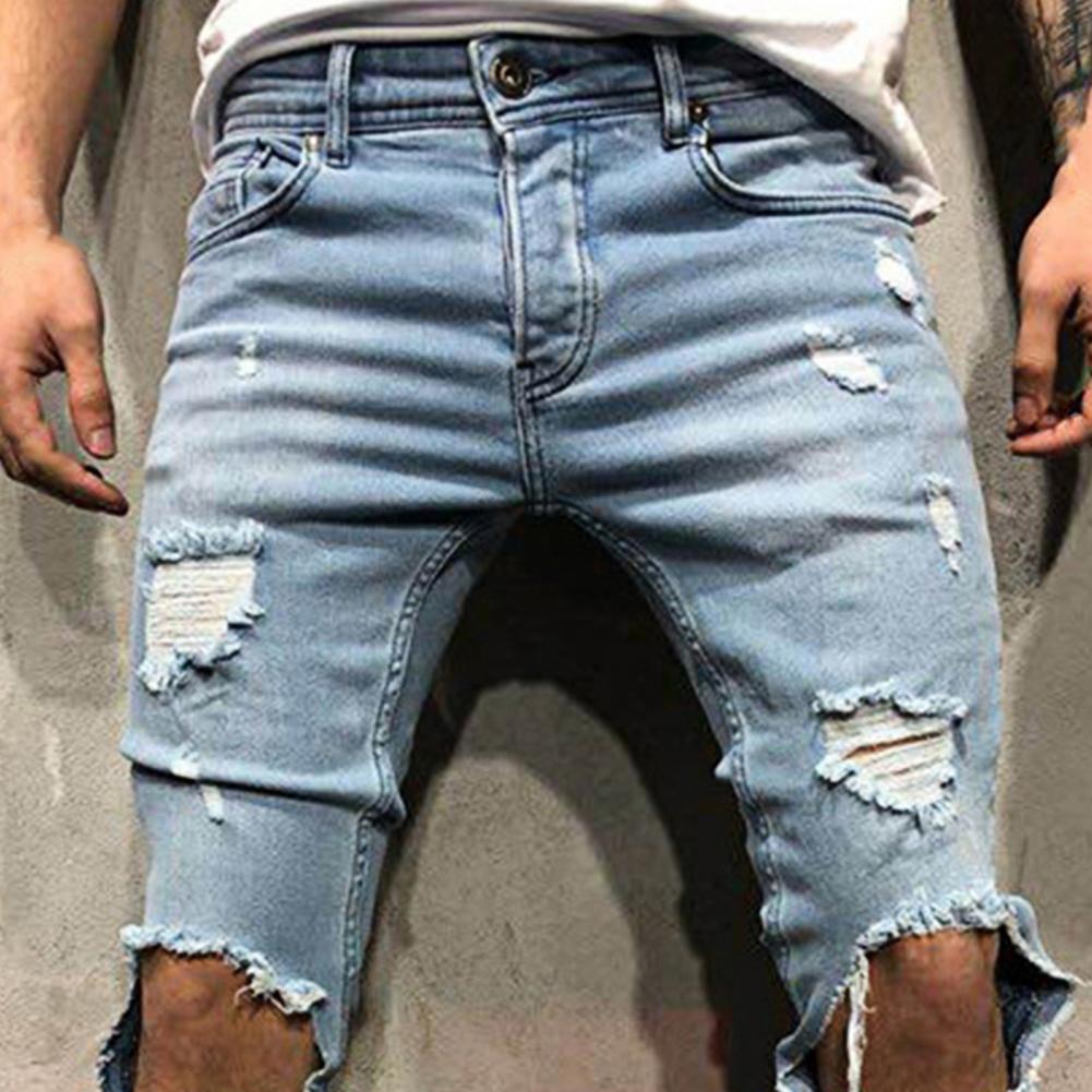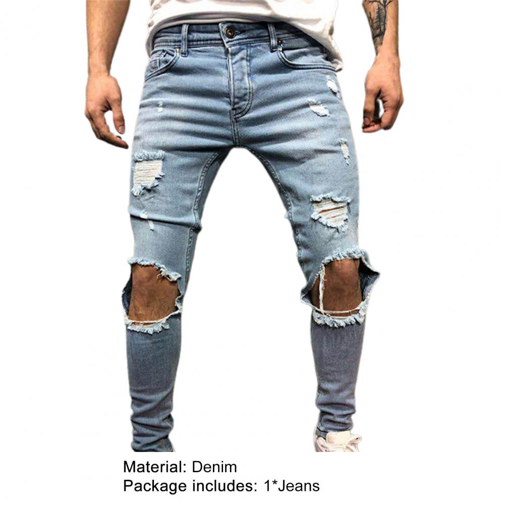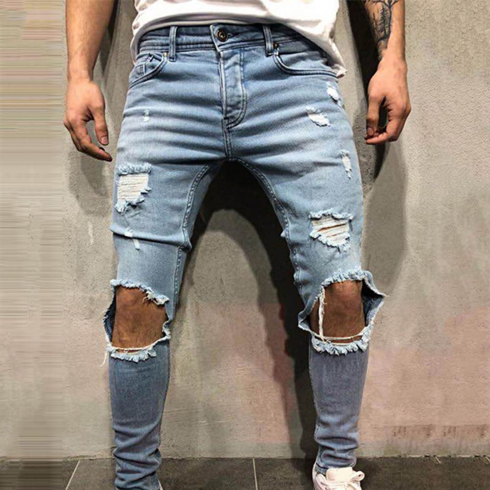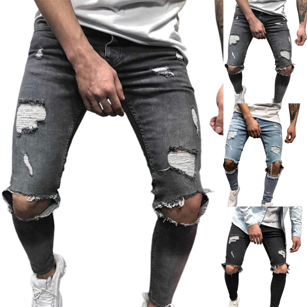 Облегающие мужские джинсы с рваными дырками, сплошной цвет и молния делают вас очень модным и модным, когда вы в этом находитесь.
