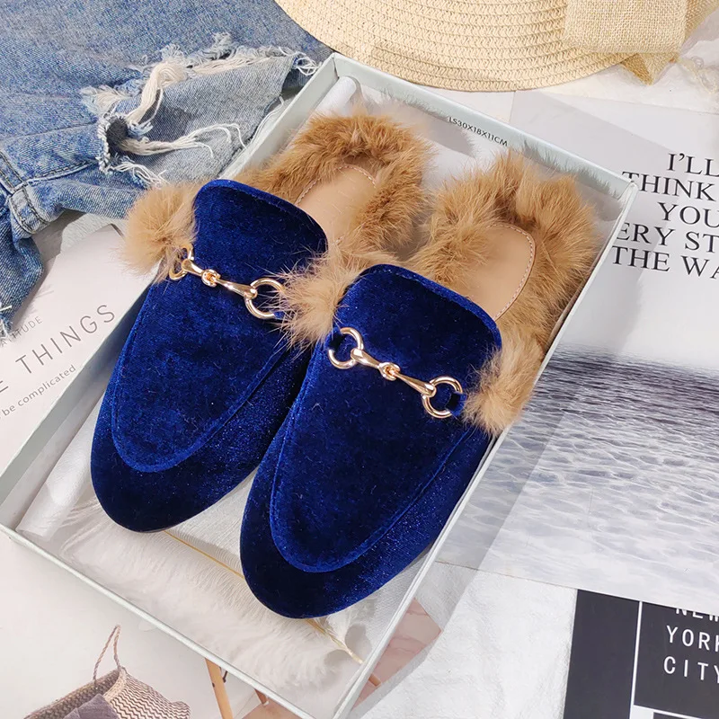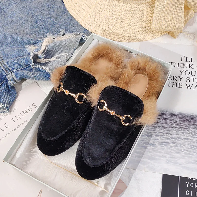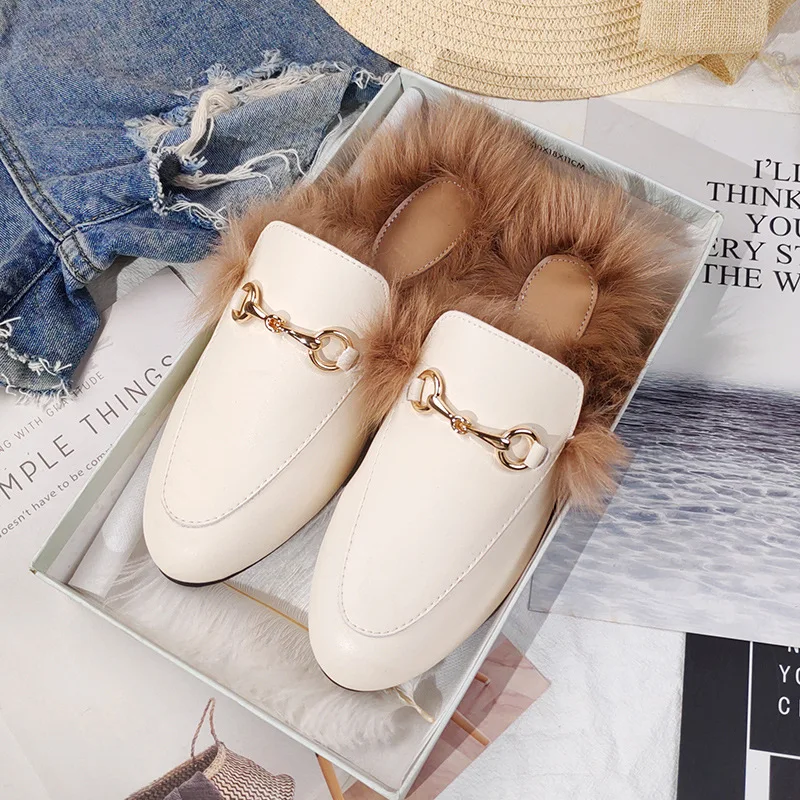 Брендовые женские зимние туфли на плоской подошве с закрытым носком; Дизайнерские стильные тапочки их меха под кролика; Уличная садовая обувь на платформе; Элегантные мюли