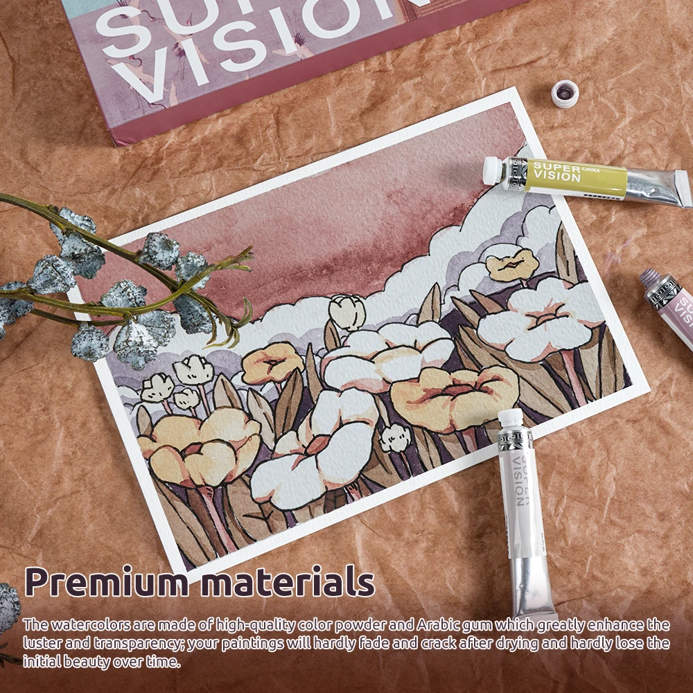 Акварельные цвета изготовлены из высококачественного цветного порошка и арабской резинки, которые значительно улучшают блеск и прозрачность; Ваши картины практически не выцветают и трескаются после высыхания и с течением времени практически не теряют первоначальную красоту.