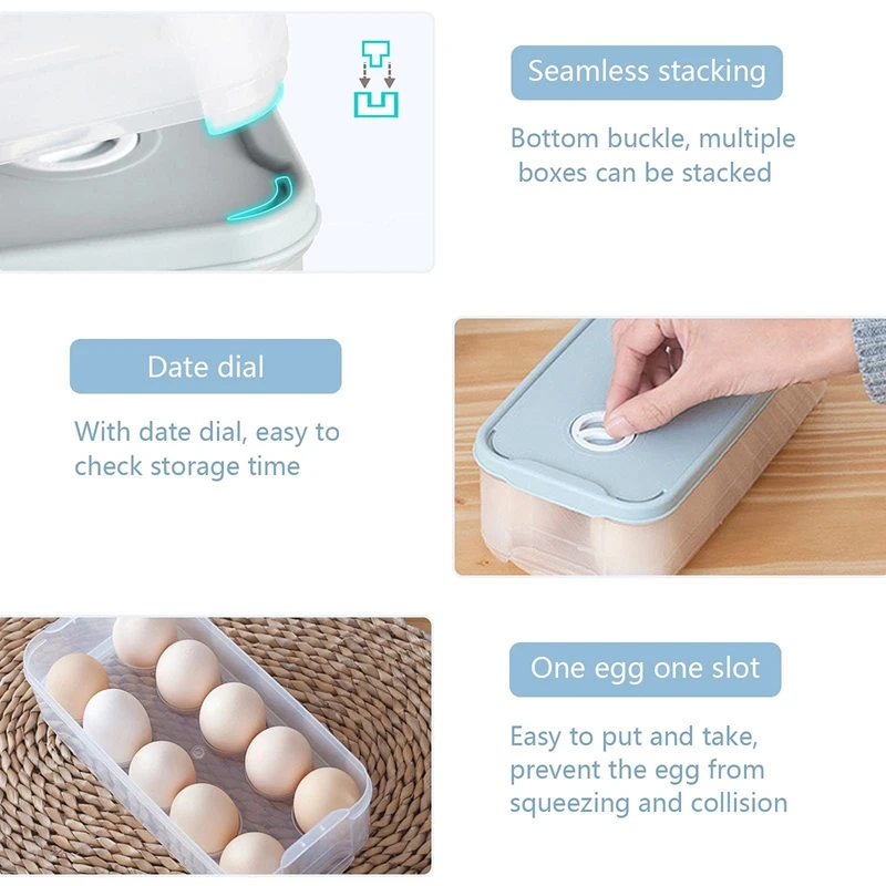 1.Stackable Fridge Egg Box: Non-slip base design, thick buckle, can be stacked in multiple layers. At the bottom of the slot, a rack and an egg can hold 10 eggs, which is more stable when stacked and an perfect choice to keep your eggs fresh and safe.
