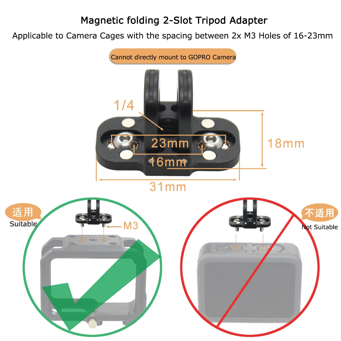 Характеристики: Магнитный Интерфейс GoPro в нижней части, нижняя часть разработана с магнитным интерфейсом для GoPro, с 1/4 "интерфейсом в середине, совместим с большинством штативов. С креплением винтов 2x M3, фиксированным расстоянием между отверстиями 16-23 мм.