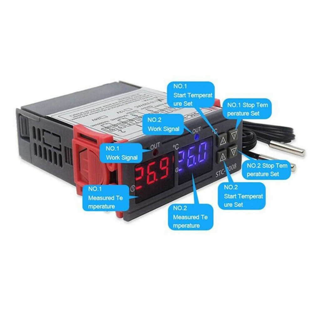 SПецификация:Переключение режимов между прохладным и теплым;Контроль температуры путем установки значения температуры и значения разницы;Калибровка температуры;Предохранение от задержки выхода холодильного контроля;Будильник, когда температура превышает Температурный Предел или когда ошибка датчика.Спецификация:Размер передней панели: 75x34,5 (мм)Размер крепления: 71x29 (мм)Размер изделия: 75x34,5x85 (мм)Длина датчика: 1 метр (включая зонд)Технические параметры:Диапазон измерения температуры: -55-120 градусов ЦельсияТочность: 0,1 по ЦельсиюЗадержка срабатывания датчика: 1 минутаИсточник питания: 12 В постоянного тока 24 В переменного тока 110-220 ВПотребляемая мощность: <3 ВтДатчик: датчик NTCКонтактная мощность реле: холодный (10А/240В переменного тока); Тепло (10А/240В переменного тока)Температура окружающей среды: 0-60 градусов ЦельсияТемпература хранения: -30-75 ЦельсияПосылка включает в себя:1 шт. STC-3008 цифровой регулятор температуры