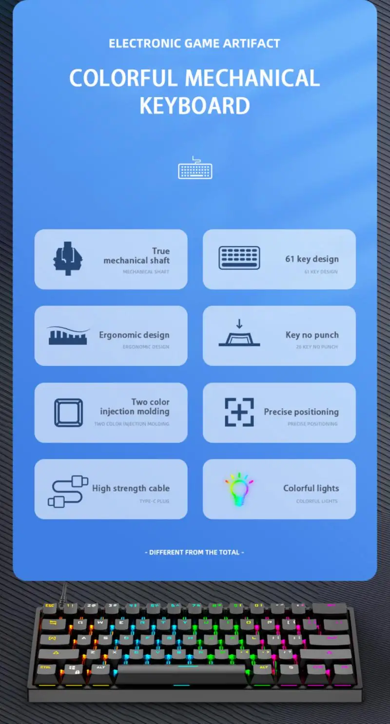 Механическая клавиатура является высокопроизводительным флеш-микрокомпьютером с одним чипом, поддерживает USB2.0 (полная скорость 12 Мбит/с) режим передачи, управление, прерывание и функции пакетной передачи данных, И имеет быструю скорость отклика. Общая 22-ключ-ударной конструкции. То есть клавиши Q A Z W S X E D C R F V T G B M Tab Capslock Shift-L Ctrl-L Alt-L Space нажимаются без коллизии.