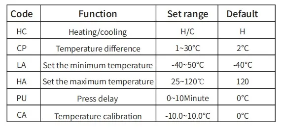 Нажмите клавишу S в течение 3 секунд, чтобы войти в режим меню программы, в котором отображается код HC. Нажмите клавишу △ или ▽, чтобы пройти HC-CP-LA-PU-CA параметров. Чтобы ввести код, нажмите клавишу S, нажмите клавишу △ или ▽, чтобы изменить желаемое значение и нажмите кнопку SET для сохранения и выхода. Настройка Температуры: короткое нажатие клавиши S (не более 2 секунд) для отображения температуры по умолчанию на заводе. Нажмите △ или ▽, чтобы изменить значение, чтобы сохранить его автоматически. (Нажмите и удерживайте кнопку △ или ▽ в течение 2 секунд, чтобы быстро настроить значение.)
