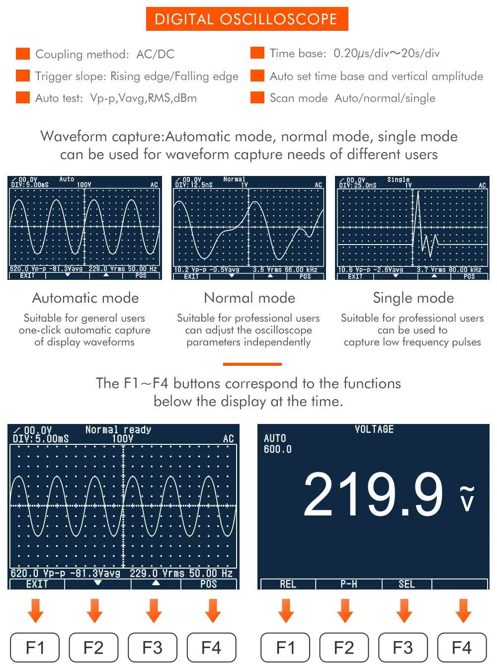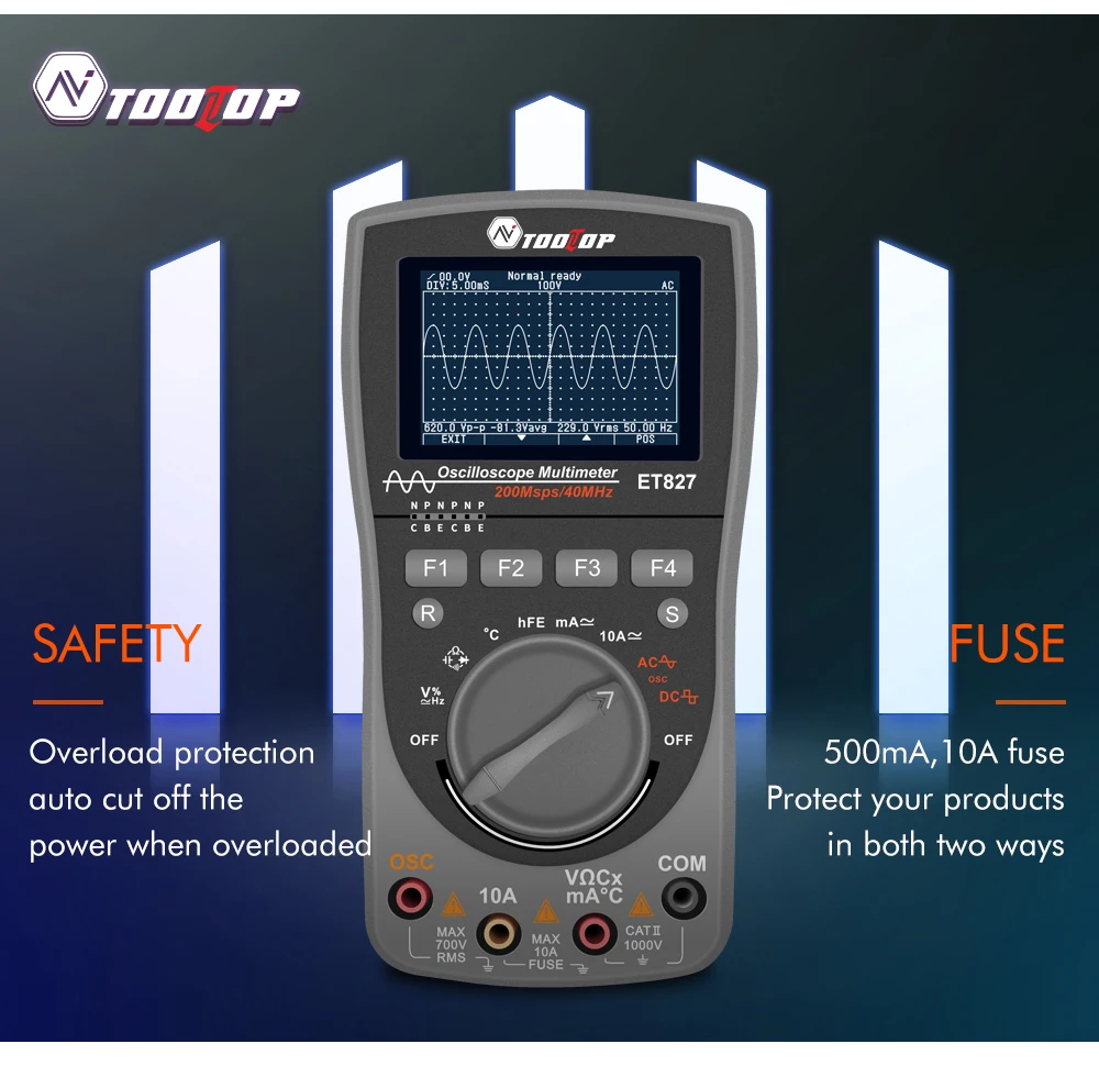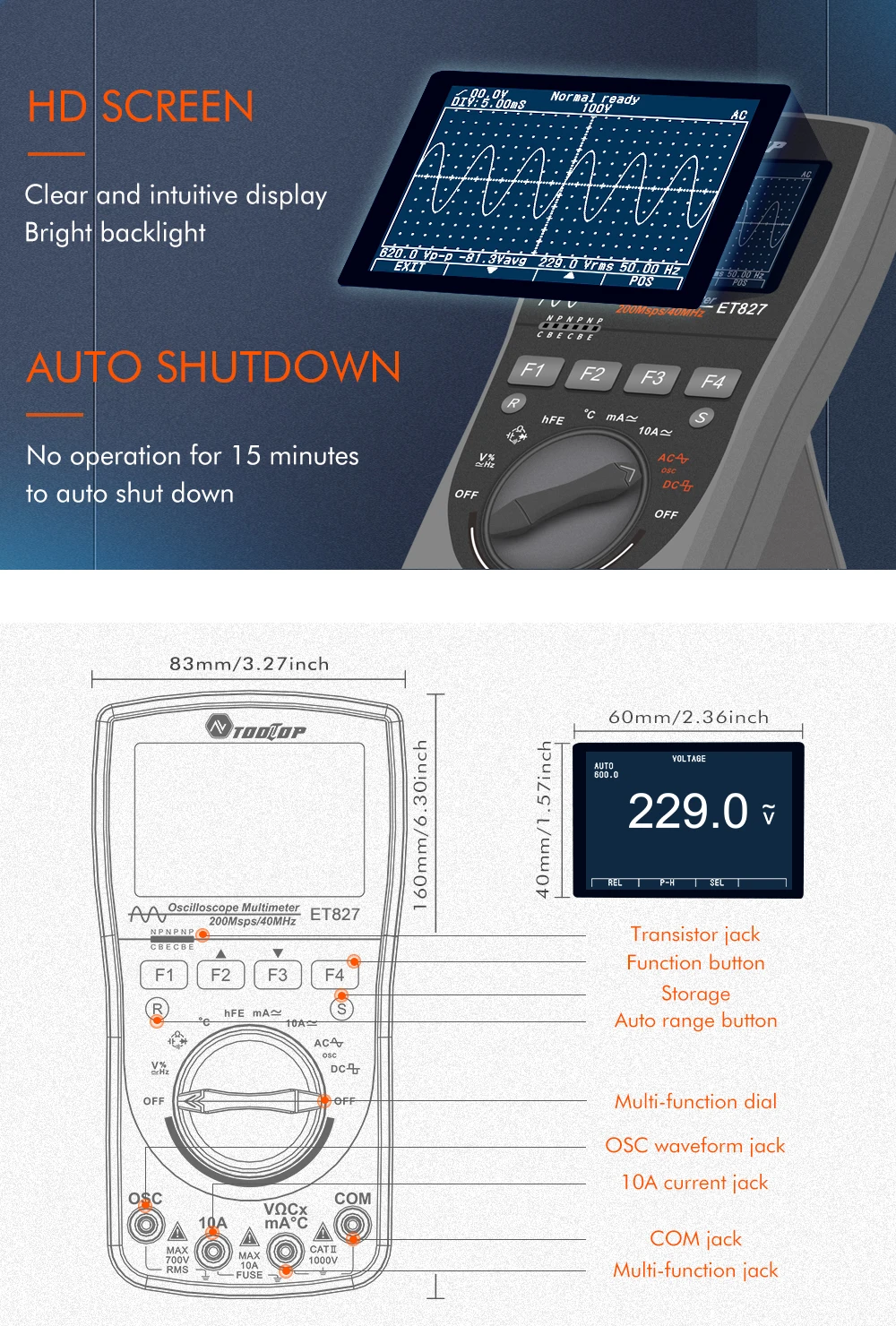 Функция 2 в 1, мультиметр + осциллограф, простой в эксплуатации и быстрое измерение, практичный в использовании.