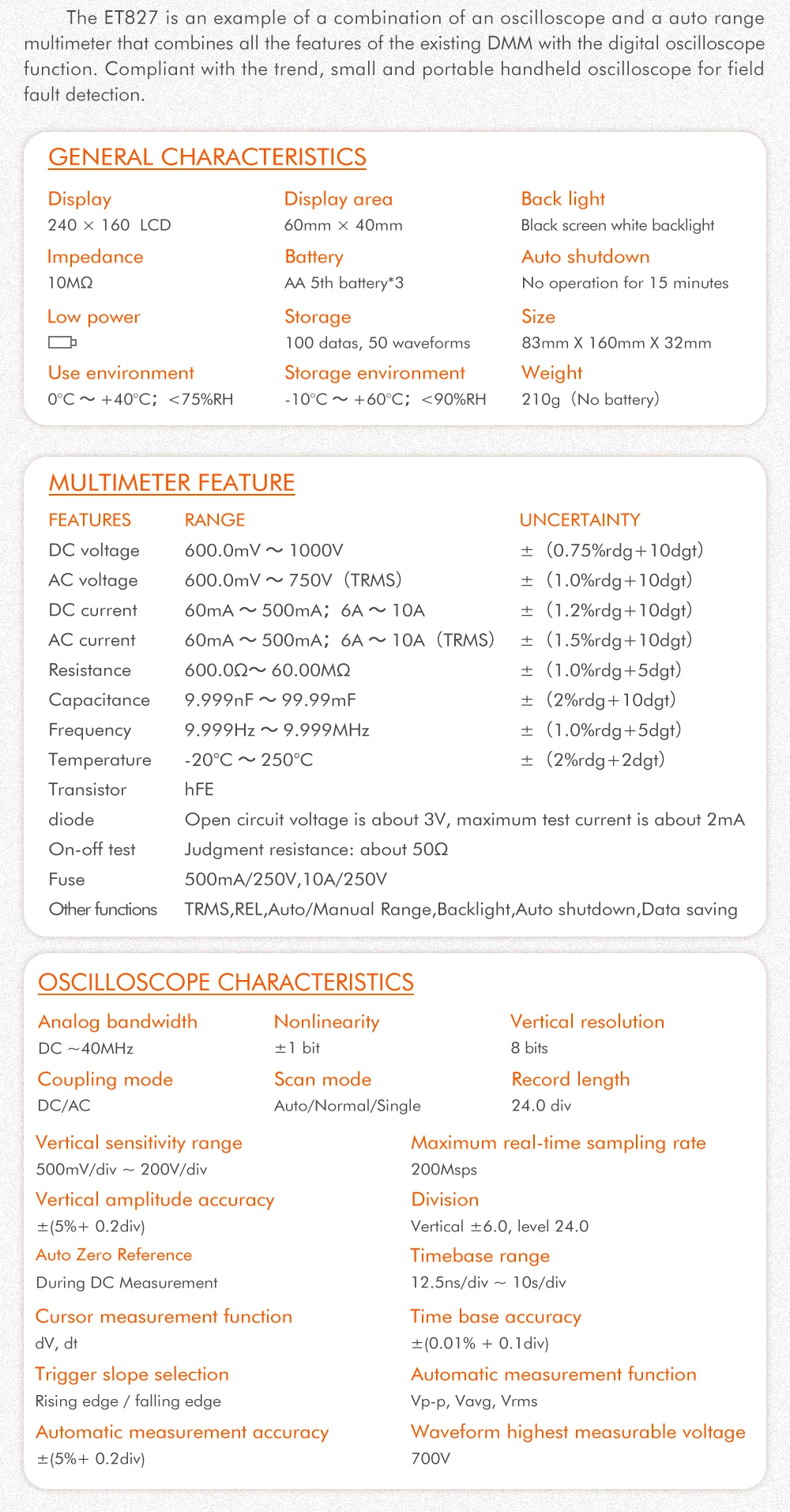 ET827 2 в 1 цифровой мультиметр осциллограф точно 100 наборы данных 40 МГц 200msps для электрика с экраном высокой четкости