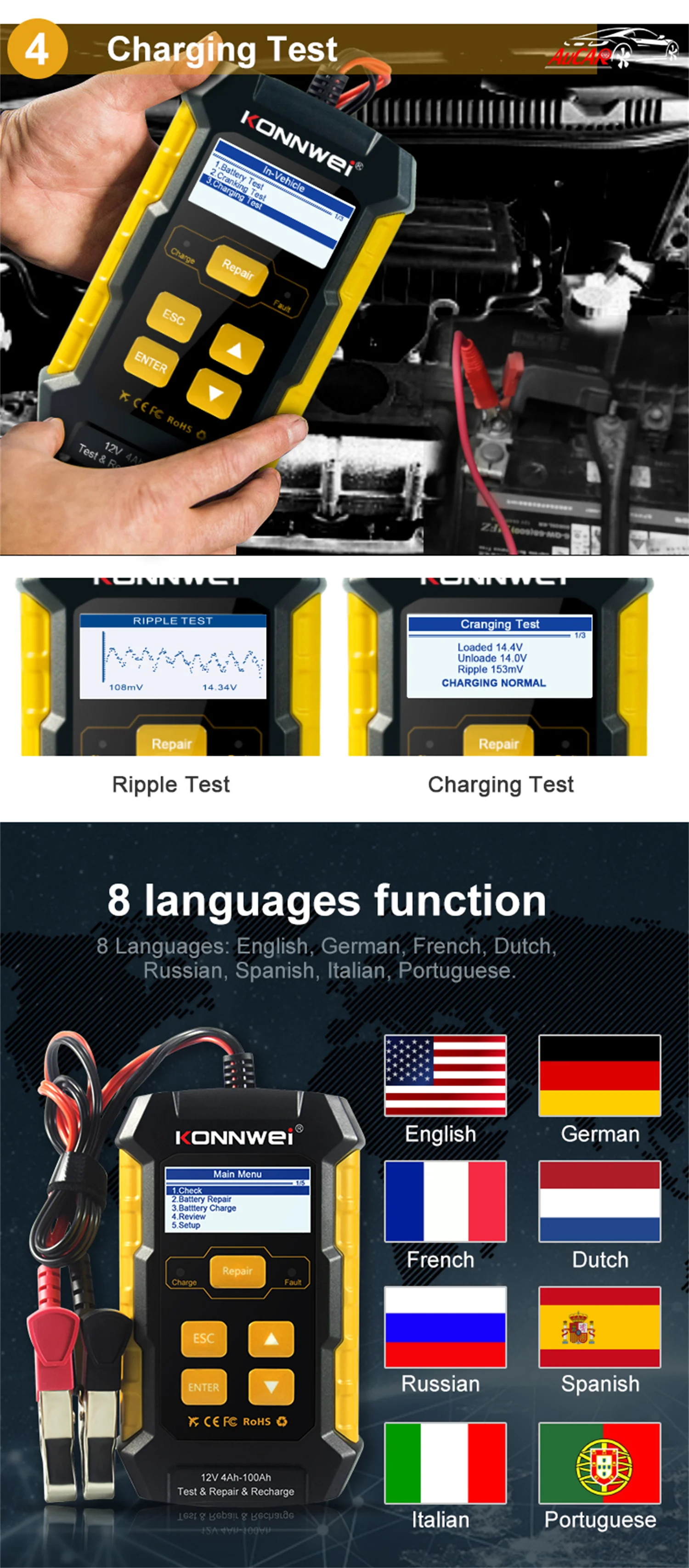 С высокой точностью тестер батареи KONNWEI характеристики, KW510 расчесывает батареи зарядки и ремонта функции и перепроектирует продукты, делает все-в-одном батарея обслуживания инструмента, whcih очень полезен и сокращает вашу работу, и это должен быть инструмент для всех владельцев автомобилей.