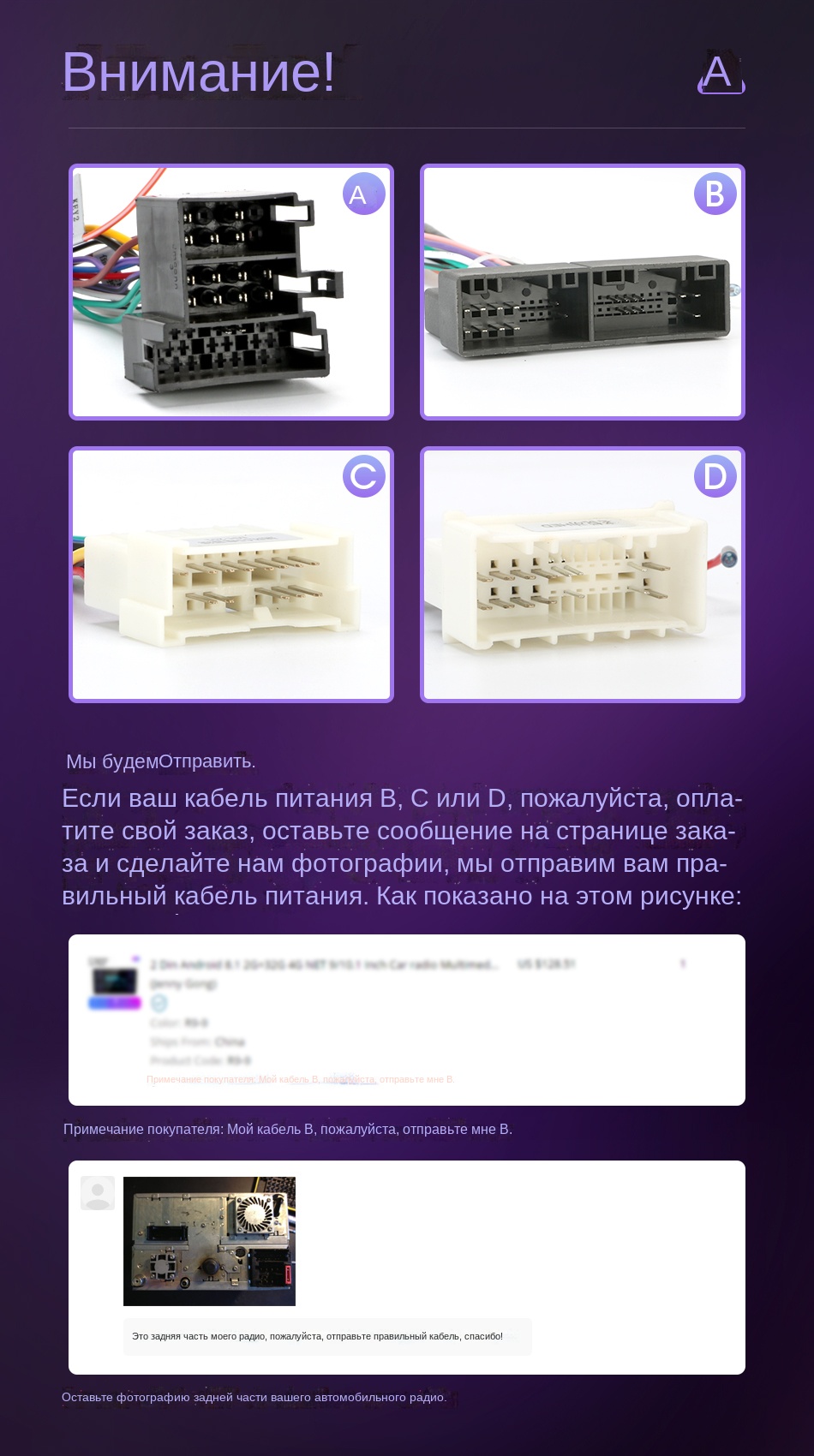 Продукт поддерживает кнопки управления рулем, Поддерживает оригинальные автомобильные камеры (требуется CANBUS), Поддерживает неоригинальные камеры (поддерживает несколько фазовых механизмов), Поддерживает оригинальные функции автомобиля, такие как настройки кондиционера (требуется CANBUS, более оригинальные функции автомобиля связаны с оригинальным автомобилем) Подходит ли для Вашего автомобиля? 1. Проверьте соответствующую модель и год продукта и автомобиля 2. Сравните положение установки продукта с автомобилем, который необходимо обновить 3. Проверьте, подходит ли интерфейс кабеля питания для вашего автомобиля (Примечание: Не все интерфейсы оригинального автомобиля должны быть подключены) 4. Если вы все еще не можете определить, пожалуйста, пришлите нам оригинальное место установки автомобильного радиоприемника (спереди) и оригинальное изображение радиоинтерфейса