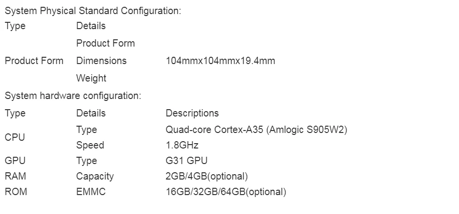 Описание:ЦП:Четырехъядерный Cortex-A35 (Amlogic S905W2)Графический процессор:G31 GPURAM:2 ГБ/4 Гб (опционально)ПЗУ:EMMC 16 Гб/32 ГБ/64 ГБ (опционально)ОС:Android 11,0WiFi:IEEE 802,11 a/b/g/n/ac (2,4G/5GH)+ BT5.0Сеть Ethernet:RJ45 10/100 мГнездо карты памяти: поддержка SDSC/SDHC/SDXCИнтерфейс USB: 2 USB 2,0Выход AV: стандартный разъем 3,5 ммРазъем постоянного тока: 4,0 мм разъем питания 5 в постоянного токаАудио/Видео выход: HDMI2.1Размер: 104x104x19.4мм Посылка Содержимое:1 * ТВ-приставка A95X W21 * пульт дистанционного управления1 * Руководство пользователя