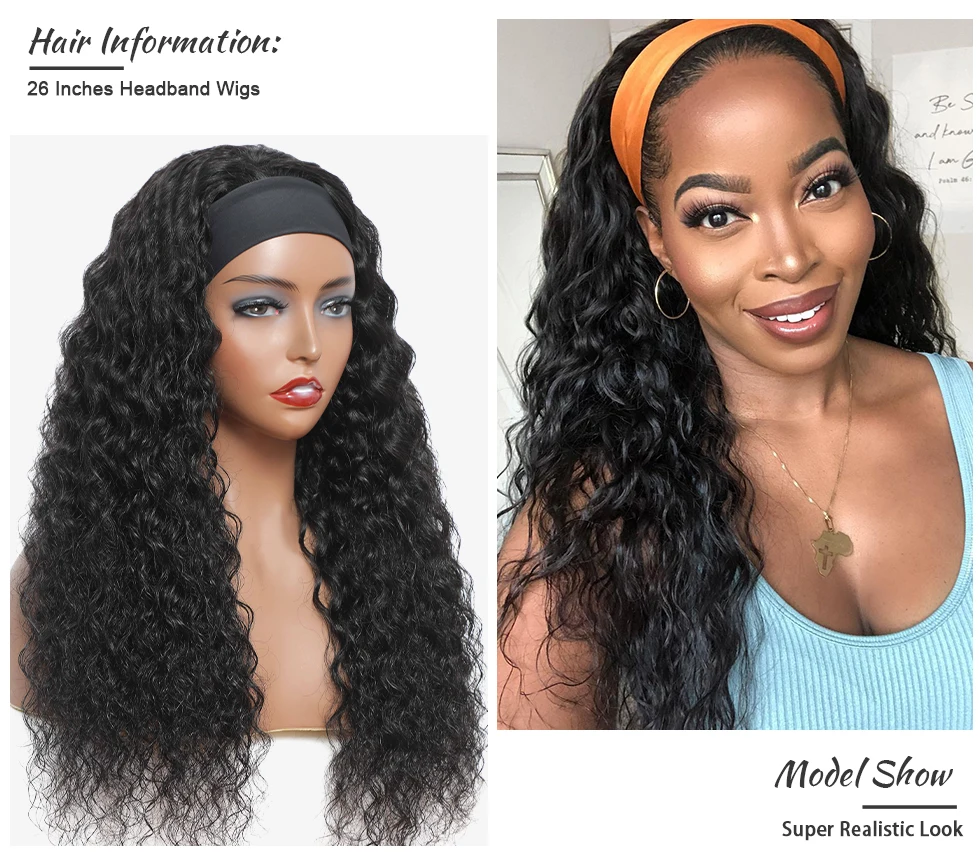 Sytle: парик с головной повязкой, парики с глубокими кудрявыми волнами, естественный цвет