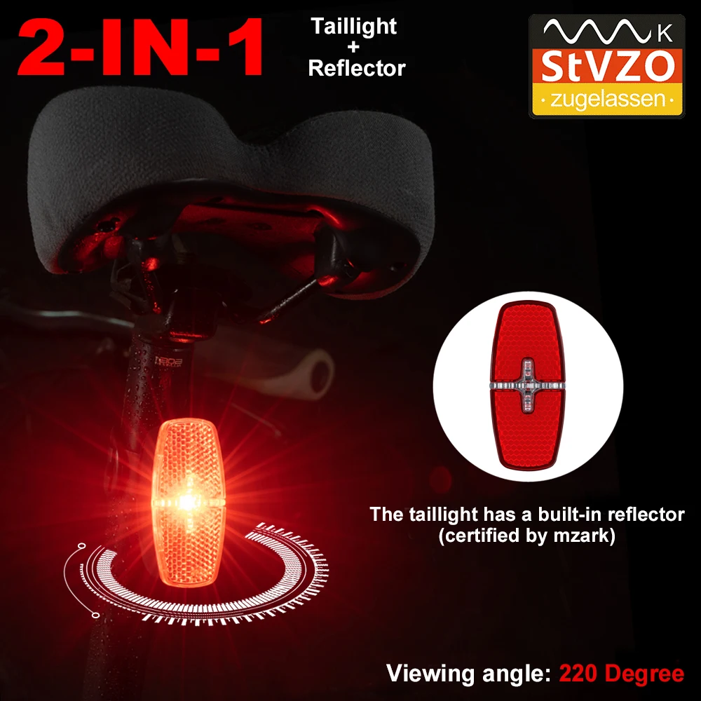 Задний светильник имеет встроенный отражатель (Сертифицированный Zmark). Даже если батареи пустые и задние фонари выключены, другой человек может немедленно напомнить им об этом. Безопаснее для ночного вождения