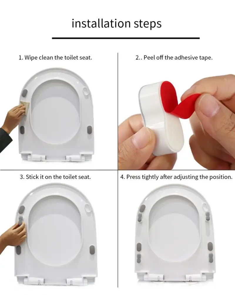 Простая установка: чистое кольцо для сиденья унитаза, сохраняет сухость, Оторвите клейкую ленту, прикрепите бампер к кольцу для сиденья унитаза, нажмите, чтобы обеспечить прочное сцепление