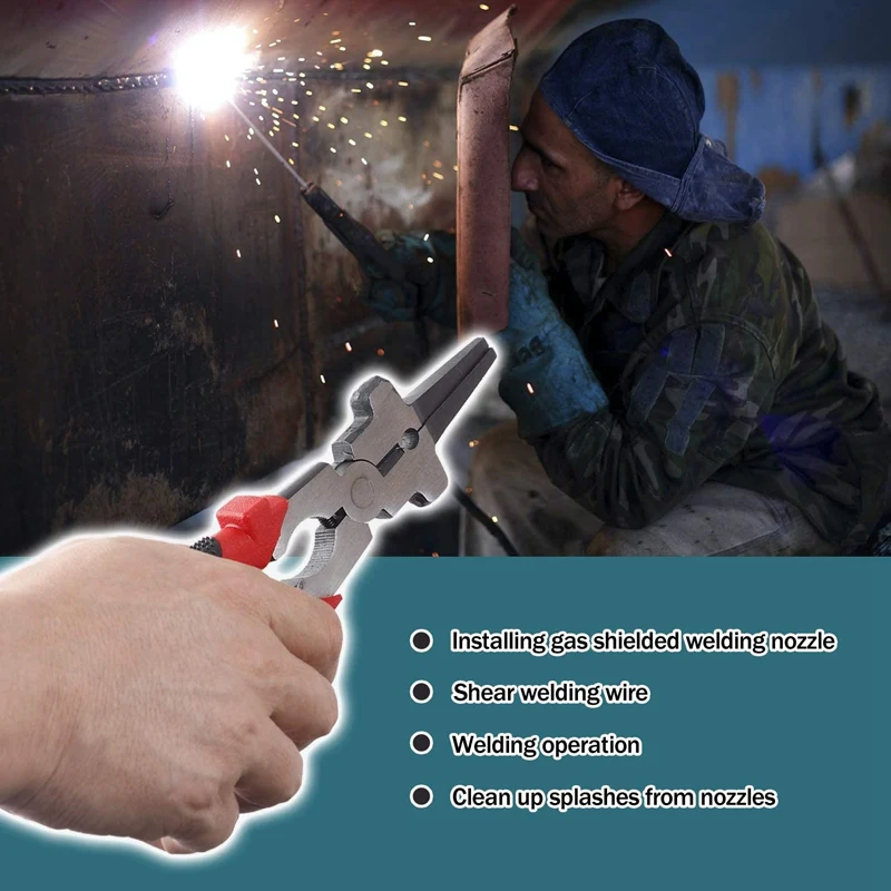 Широко используется-идеальный сварочный инструмент для электрического, механического, цеха, фермы, домашнего использования. Например, резка проводов, удаление и установка насадок/контактных наконечников, молоток, очистка брызг и многое другое