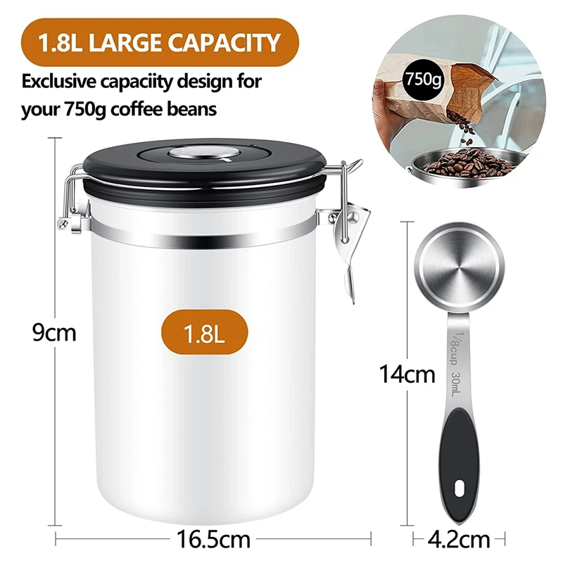 До Емкость 1,8 L / 750g: Большая емкость зерна кофе контейнер, хранит до 1,8 L или до 750 г. Безопасное хранение кофейного олова и легко моется, рекомендуется чистить влажной или сухой тканью, Не мойте его в воде. Легкий и портативный, вы можете взять его в свой дом, офис или куда угодно.