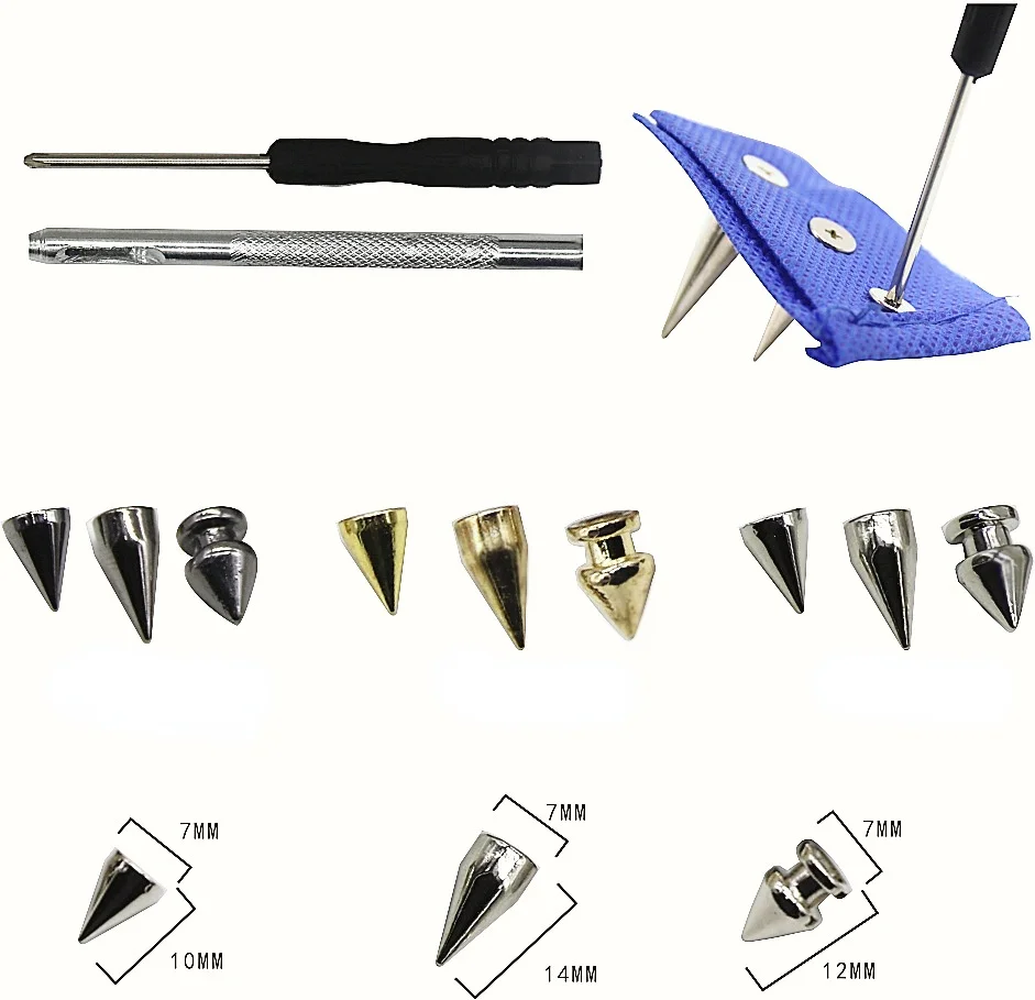 Тип: заклепкиМатериал: металлЦвет: серебристый, черный, золотойКоличество: 100 комплектовФорма: конусные шипыПодходит для: воротников, джинсов, обуви, шляп, хлопковой одежды, рубашек, ветровок, ремней, рюкзаков, свитеров, пуховиков, чонсам, курток, сумокРазмер: 7 мм x 10 мм, 7 мм x 12 мм, 7 мм x 14 ммРазмер коробки: 12,7x6,7x2 см Посылка включает в себя:1x100 шт заклепки (С инструментами)